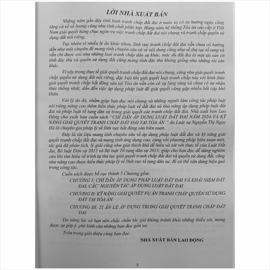 Chỉ Dẫn Áp Dụng Luật Đất Đai Năm 2024 & Kỹ Năng Giải Quyết Tranh Chấp Đất Đai Tại Tòa Án Tác giả: Luật sư Nguyễn Thị Ngọc Hà Nhà xuất bản: Lao Động Khổ
