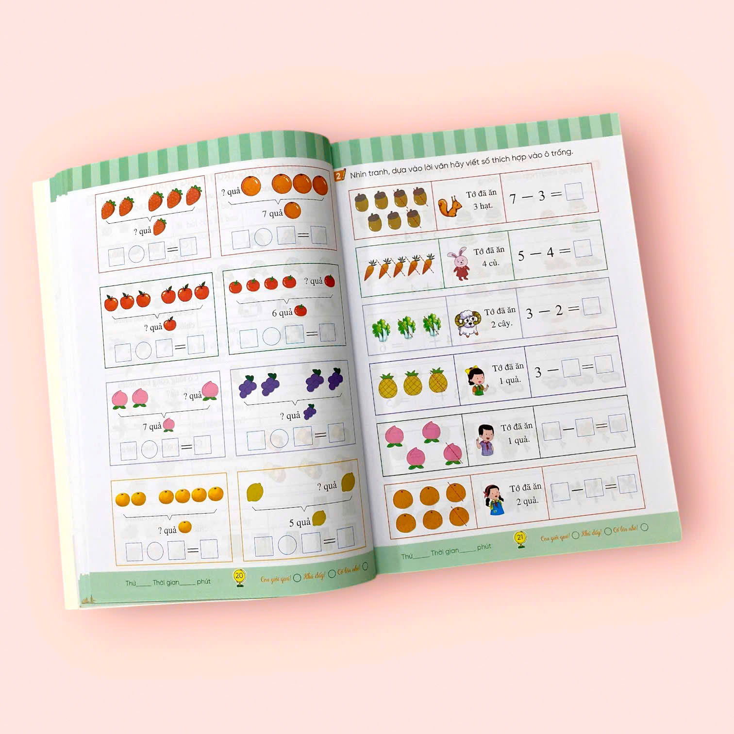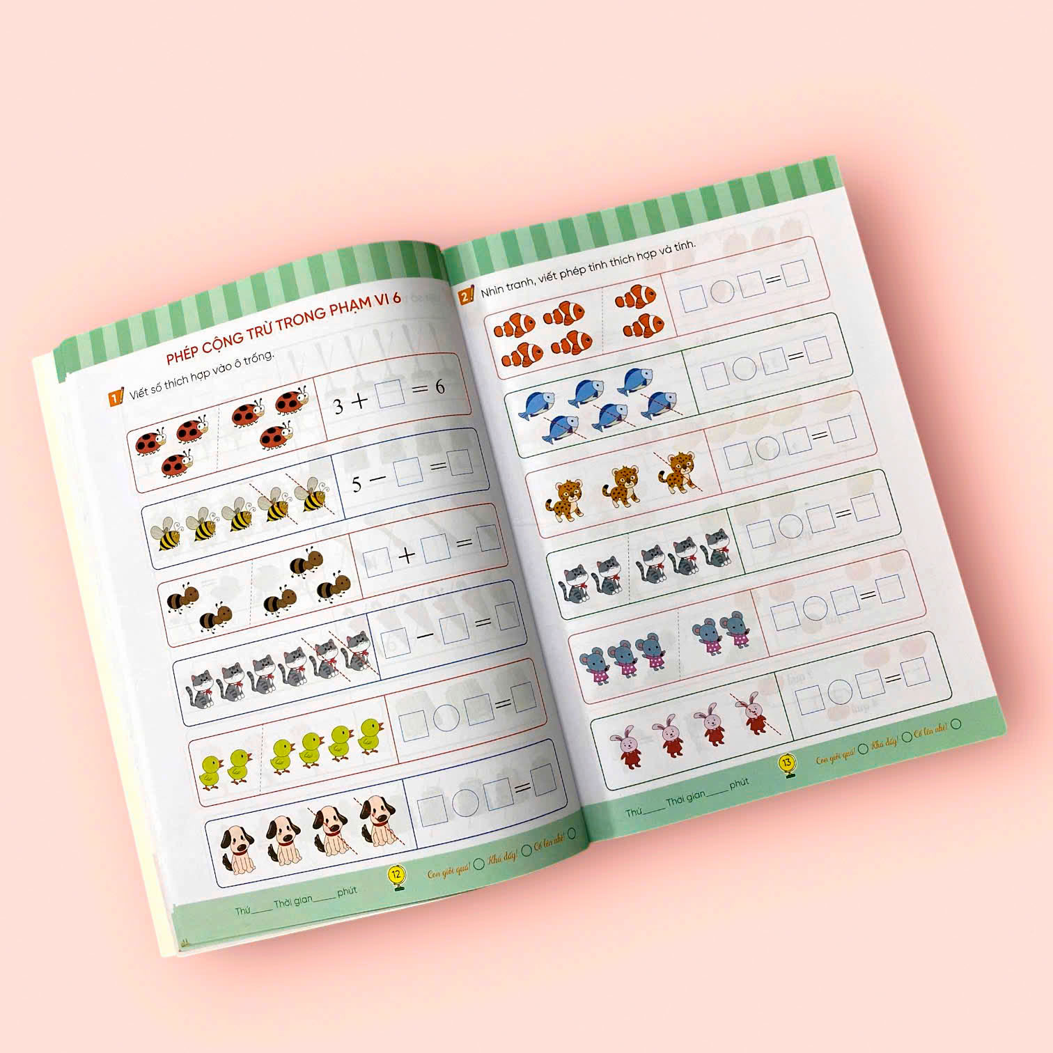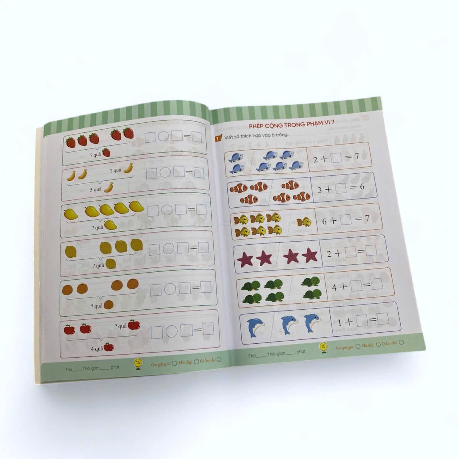 Nội dung và hình ảnh được thiết kế phù hợp với trẻ tiền tiểu học, giúp bé dễ dàng nắm bắt và hứng thú với môn toán.