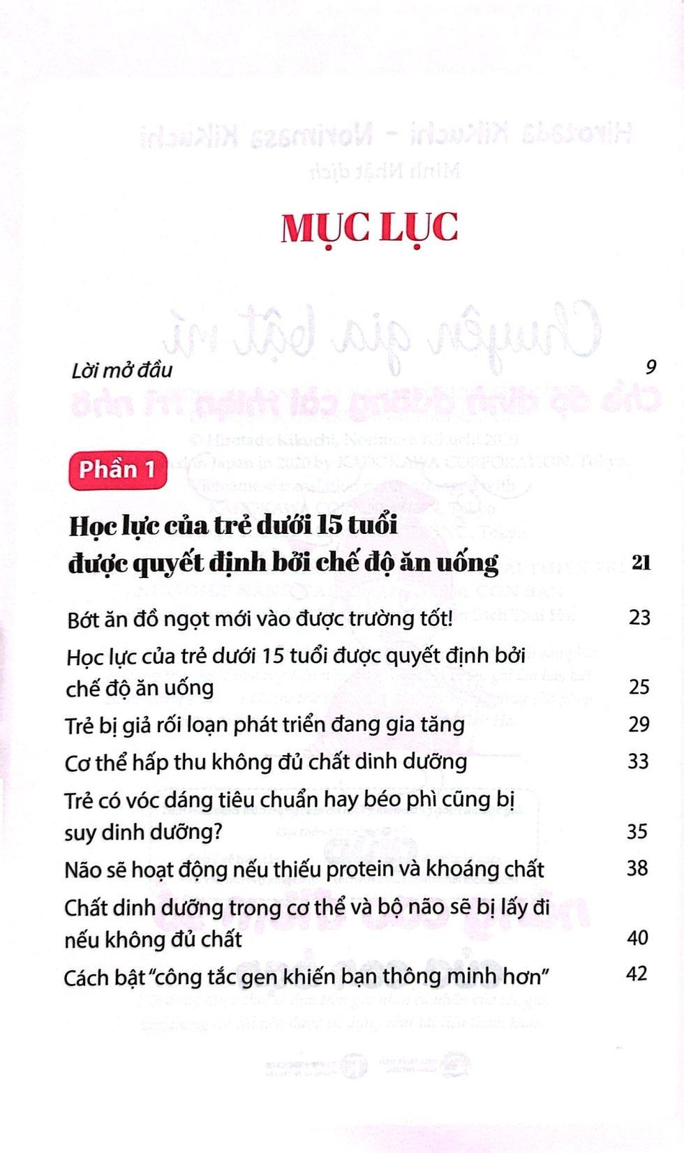 Chuyên gia bật mí: Chế độ dinh dưỡng cải thiện trí nhớ giúp nâng cao điểm số của con bạn mang đến phương pháp khoa học và dễ áp dụng để giúp trẻ vừa khỏe mạnh, vừa nâng cao thành tích học tập. Cuốn sách được viết bởi Hirotada Kikuchi – một nhà giáo dục kỳ cựu, và Norimasa Kikuchi – chuyên gia dinh dưỡng hàng đầu.