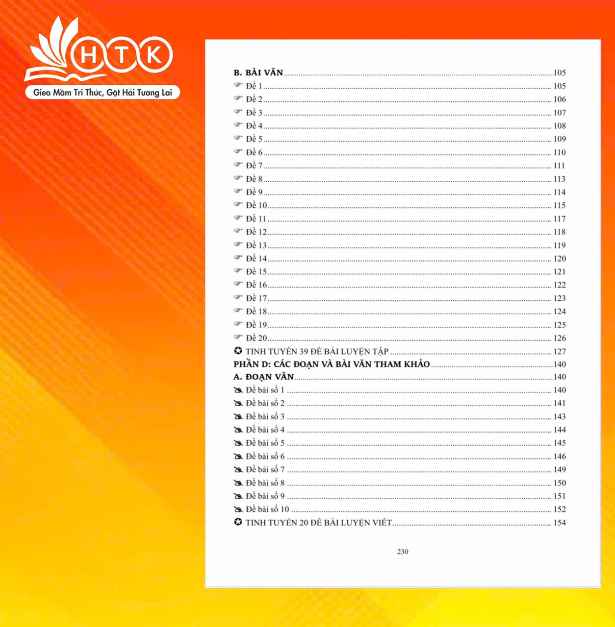 Điểm đáng chú ý của cuốn sách này là tuyển chọn 20 đề thi và đáp án, biểu điểm tham khảo cùng nhiều đề bài luyện tập hay được sưu tầm và tuyển chọn. Để giúp các em có thêm nguồn tư liệu tham khảo thật phong phú, ngoài các đoạn văn, bài viết của học sinh đã được chỉnh sửa và hoàn thiện, tôi xin phép được trích dẫn một số tác phẩm của nhà văn, nhà thơ, các nhà phê bình; tham khảo các kiến thức Lí luận văn học và sử dụng một số đề thi và đáp án, biểu điểm chính thức của Sở Giáo dục và Đào tạo một số tỉnh thành, của Bộ Giáo dục và Đào tạo trong thời gian gần đây.