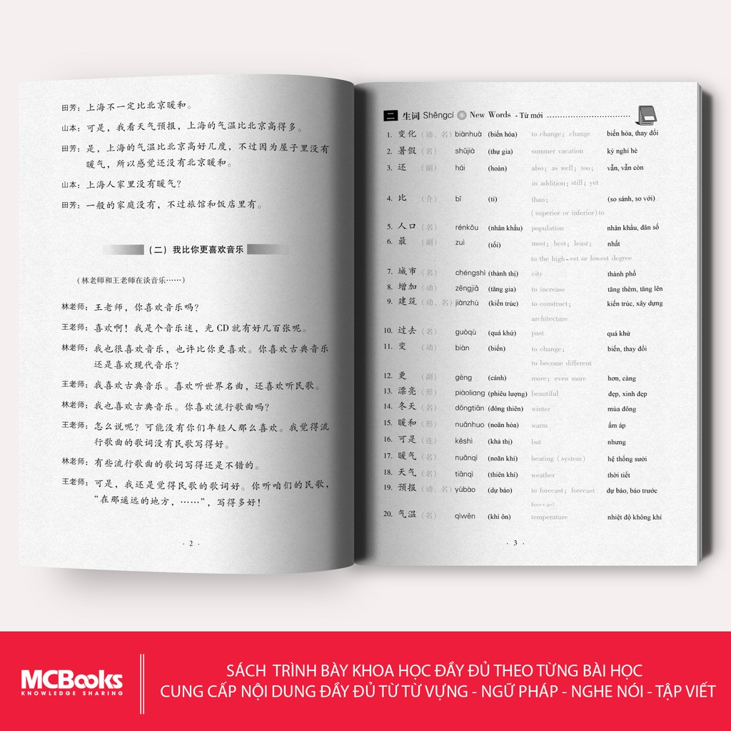 Các bài học trong “Giáo trình Hán ngữ 2 Tập 1 Quyển hạ phiên bản 3″ được Mcbooks thiết kế như sau: 1. Bài đọc, 2. Từ mới, 3. Chú thích, 4. Ngữ âm, Ngữ