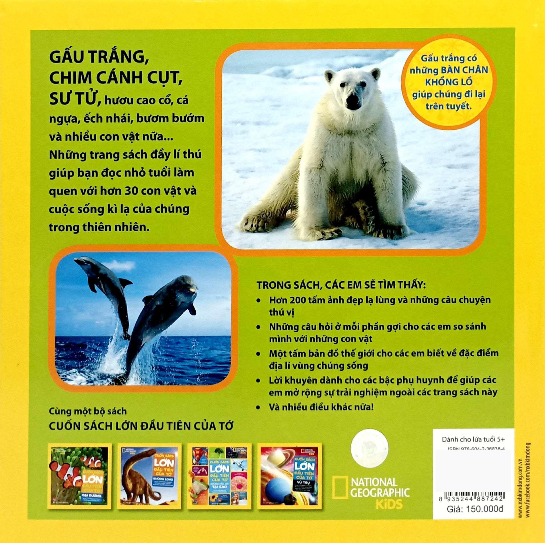Mua tại TiktokCuốn Sách Lớn Đầu Tiên Của Tớ - Động Vật (Tái Bản 2024) GẤU TRẮNG, CHIM CÁNH CỤT, SƯ TỬ, hươu cao cổ, cá ngựa, ếch nhái, bươm bướm và nhiều con vật nữa... Những trang sách đầy lí thú giúp bạn đọc nhỏ tuổi làm quen với hơn 30 con vật và cuộc sống kì lạ của chúng trong thiên nhiên. TRONG SÁCH, CÁC EM SẼ TÌM THẤY:
