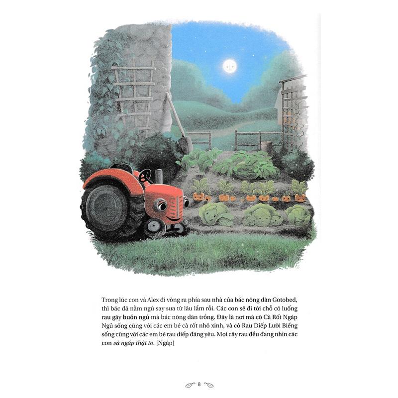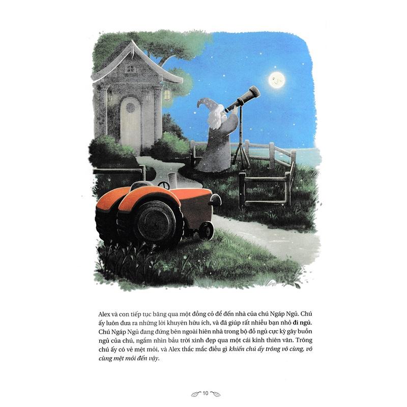 Và Alex đã gặp cô Diếp, cô Cà Rốt, chú Ngáp Ngủ, bạn Voi Ellen, bạn Hoa Sara, bạn Leon Sắp Ngủ, Chuột Chũi Gà Gật, Thỏ Roger, … Và thế trên hành trình đó, Alex đã thực sự buồn ngủ. Và đương nhiên bé nhà bạn cũng sẽ cùng với Alex chìm trong giấc ngủ ngay thôi.