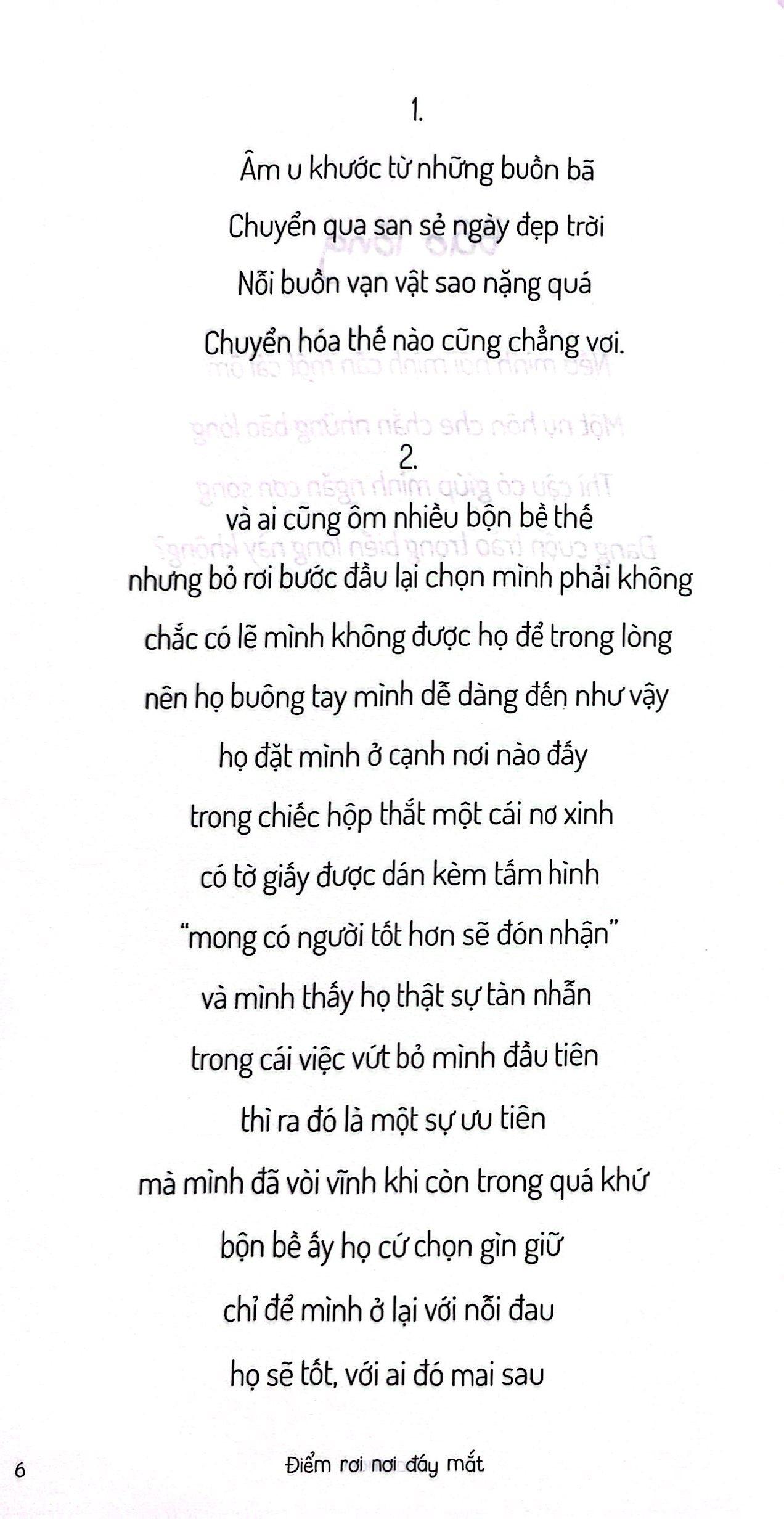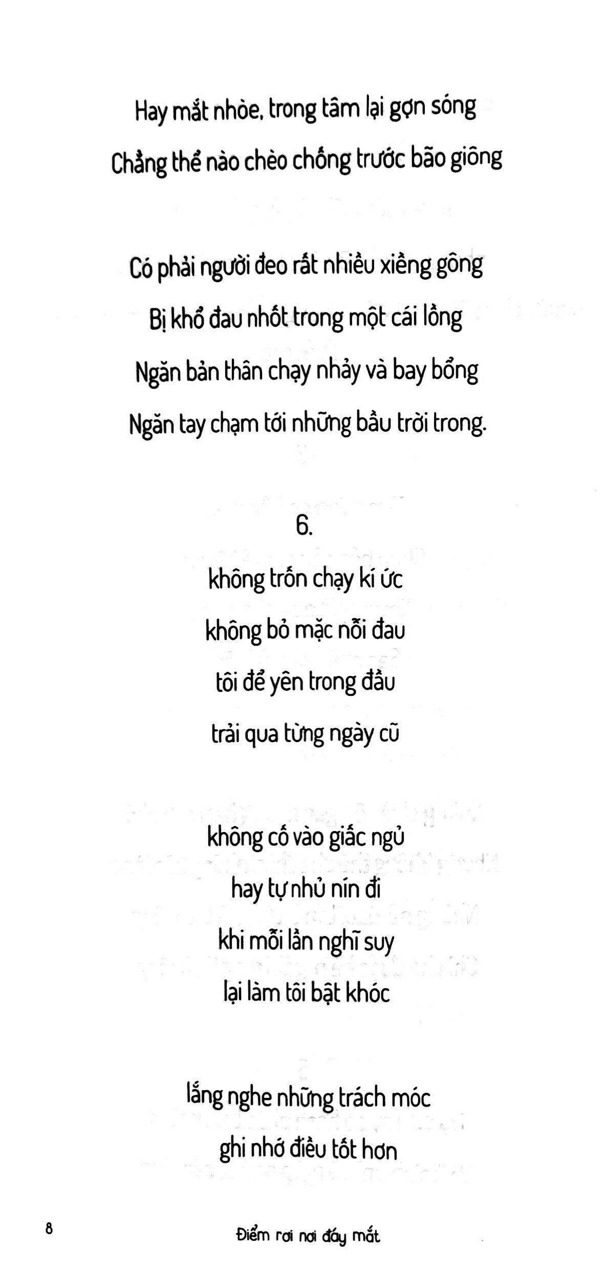 “Điểm rơi nơi đáy mắt” chứa đựng những lời thơ và câu văn đầy bất lực day dứt về một tuổi trẻ bị phủ bởi những vết xước mà cuộc sống này đem lại. Cuốn sách tựa sợi dây níu kéo bạn lại với thế giới này, tựa chiếc ôm ấm áp, đầy dịu dàng và thấu hiểu ôm lấy bạn nếu bạn đang: