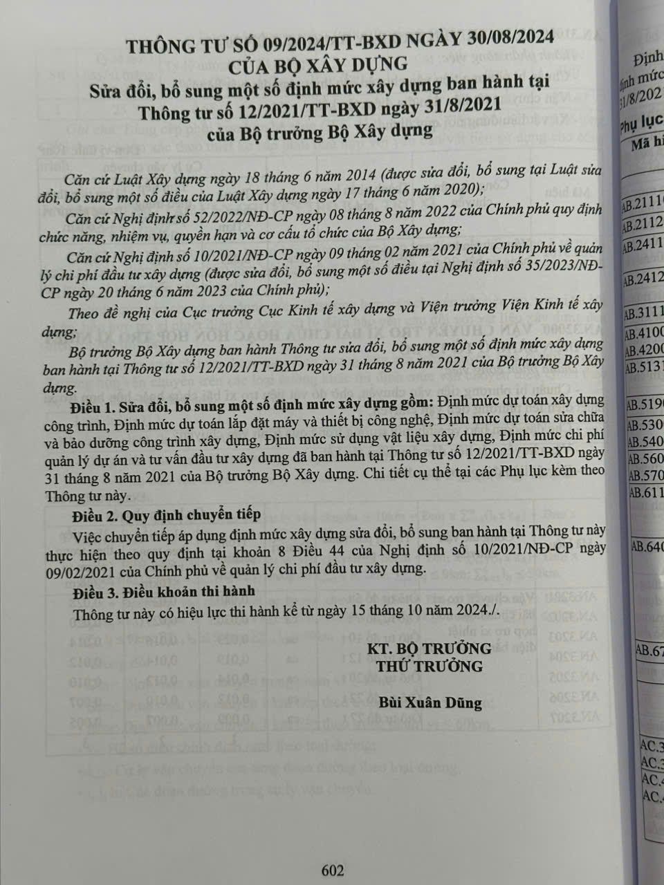 Ngày 30/08/2024 Bộ Xây dựng đã ban hành Thông tư 09/2024/TT-BXD về việc ban hành định mức xây dựng, sửa đổi, bổ sung một số định mức xây dựng ban hành tại Thông tư số 12/2021/TT-BXD ngày 31/8/2021 của Bộ trưởng Bộ Xây dựng