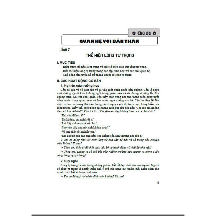 Ở từng bài, các em có thể thực hiện hoạt động theo thứ tự hoặc theo từng phần: đọc câu chuyện, xử lí các tình huống, chia sẻ, nhận diện và hành động,... liên quan đến hành vi, thói quen đạo đức, kĩ năng sống của bốn chủ đề nêu trên. Có những hoạt động các em sẽ thực hiện được ngay nhưng cũng có những hoạt động nếu các em chưa giải quyết được thì đừng nản chí mà hãy kiên nhẫn, bình tĩnh suy nghĩ, nhất định sẽ khám phá và làm chủ được vấn đề.