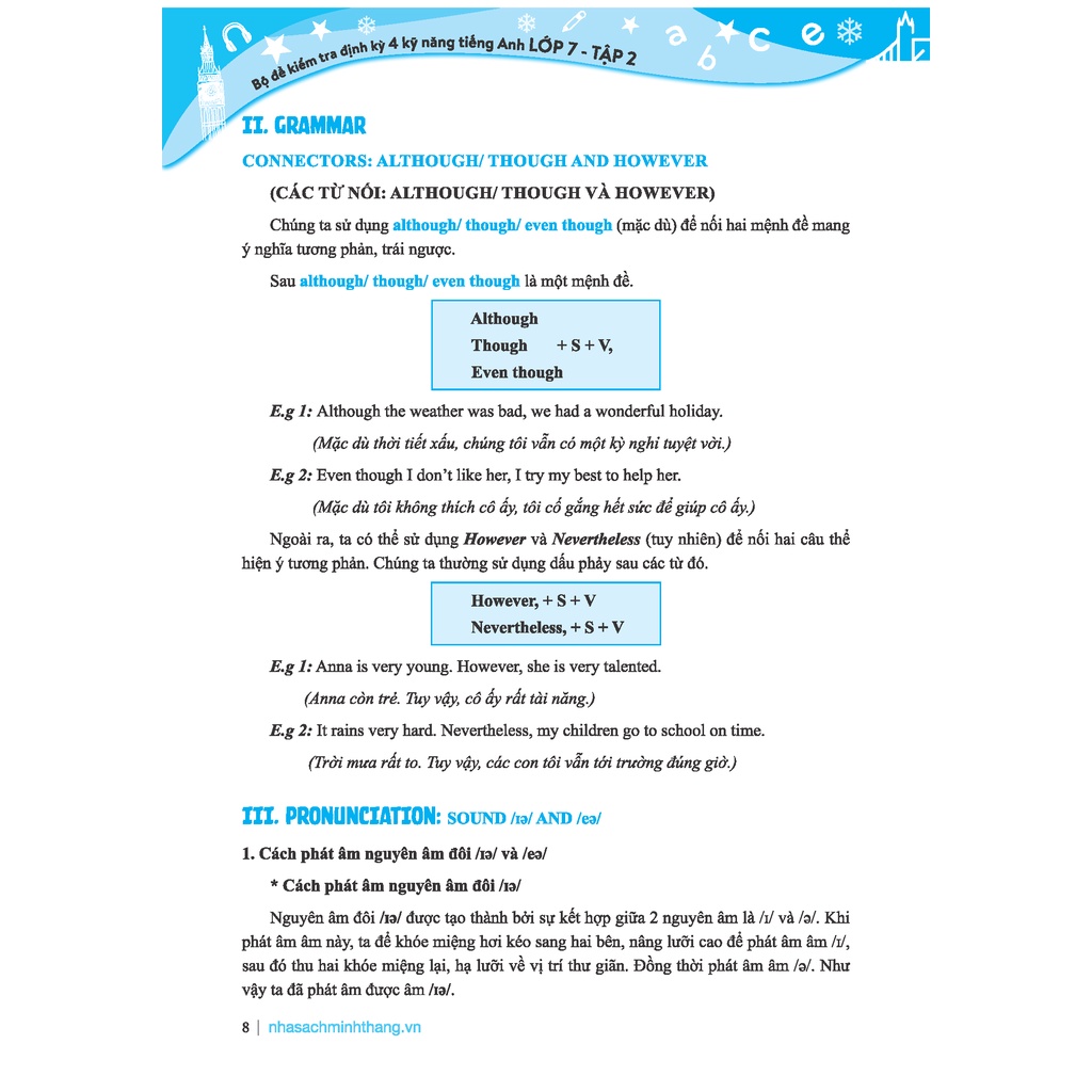 Trên hành trình tìm kiếm tri thức, các em thường xuyên phải đối mặt với các bài kiểm tra định kì, khiến các em cảm thấy căng thẳng, lo lắng và đôi khi kết quả không như mong đợi. Điều này không hẳn do các em chưa thật sự chăm chỉ hay không hiểu bài dẫn đến kết quả không đạt được như kỳ vọng, đôi khi còn phụ thuộc vào nhiều yếu tố như kĩ năng làm bài, kĩ năng quản lý thời gian hay chưa nắm được kết cấu đề Thấu hiểu được những khó khăn và những tình huống các em thường gặp phải, nhóm tác giả đã dành nhiều thời gian biên soạn “Bộ đề kiểm tra định kỳ 4 kỹ năng nghe - nói - đọc - viết Tiếng Anh lớp 7” nhằm rên luyện cho các em kĩ năng làm bài thi, làm chủ các dạng đề, hiểu được kết cấu và cách thức ra đề của từng kỳ thi. Khi các em đã quen với các dạng bài tập và trải nghiệm làm đề thường xuyên thì việc tự tin trước các kỳ thi là điều hiển nhiên có được.