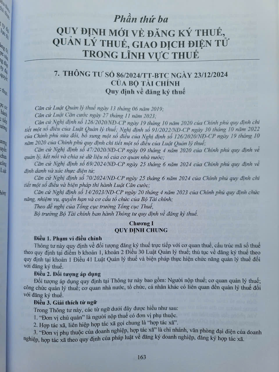 Thời gian qua Chính phủ, Bộ Tài chính đã sửa đổi, bổ sung cũng như ban hành nhiều chính sách mới trong lĩnh vực thuế như Thông tư số 86/2024/TT-BTC ngày 23/12/2024 Quy định về đăng ký thuế, Thông tư số 46/2024/TT-BTC ngày 09/07/2024 Sửa đổi, bổ sung một số Điều của Thông tư số 19/2021/TT-BTC ngày 18/3/2021 hướng dẫn giao dịch điện tử trong lĩnh vực thuế…