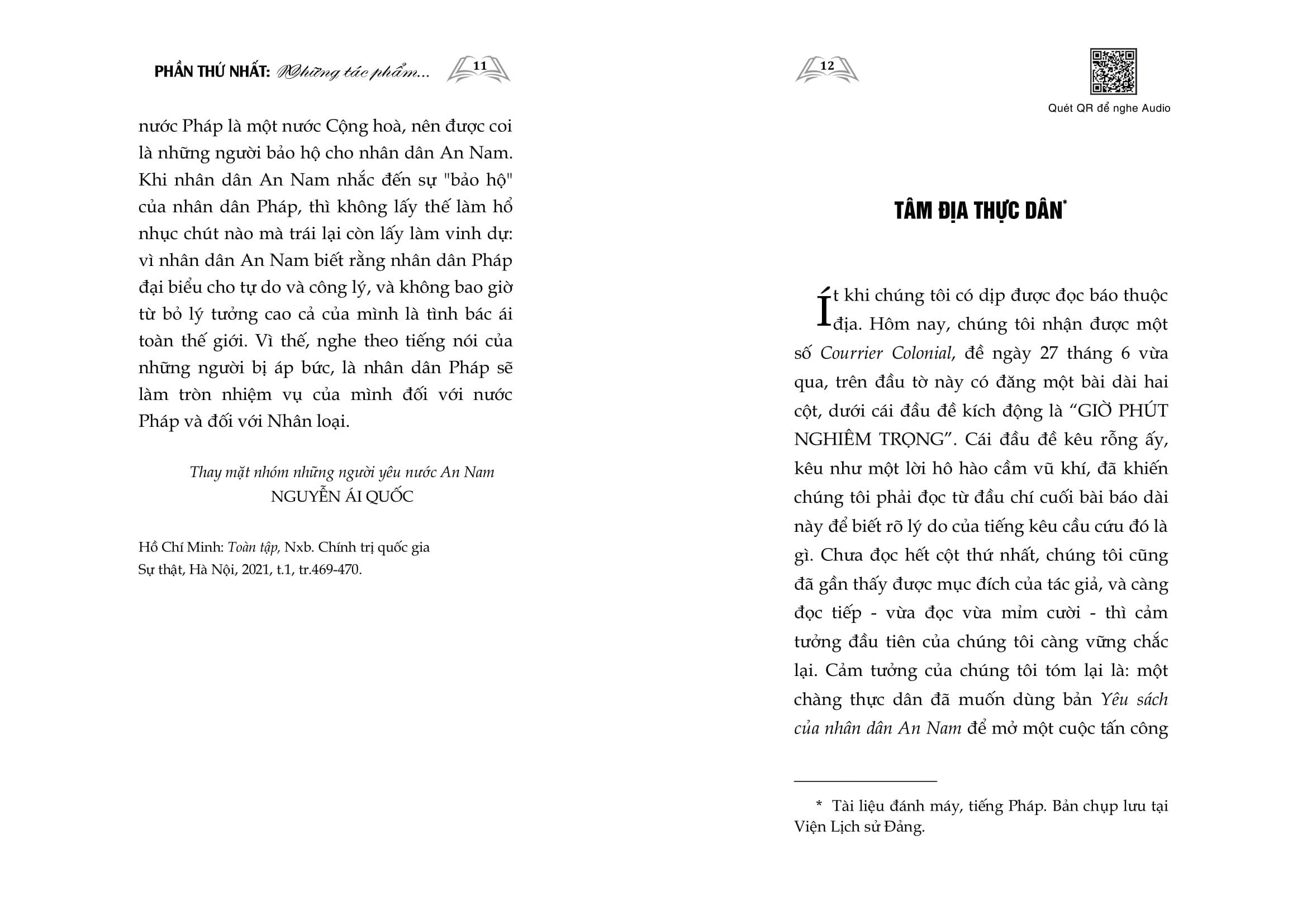 Cuốn sách là tập hợp một số tác phẩm chính luận trước 1969 của Chủ tịch Hồ Chí Minh, đặc biệt trong giai đoạn trước 1945. Đây là tư liệu then chốt để hiểu quá trình hình thành tư duy chính trị và chiến lược hành động của ông. Trong thời kỳ hoạt động tại Pháp, Anh, Liên Xô và Trung Quốc, Hồ Chí Minh đ.ã sử dụng chính luận như một công cụ để cất tiếng, xây dựng hình ảnh, tập hợp lực lượng trên các diễn ngôn quốc tế, với nội dung về chủ nghĩa đế quốc, quyền dân tộc và tình cảnh các nước thuộc địa. Những tác phẩm này thể hiện tư duy phân tích sắc sảo, hệ thống lập luận chặt chẽ, khả năng điều chỉnh giọng điệu và thông điệp tùy theo đối tượng tiếp nhận, và trên hết là nghệ thuật viết văn chính luận xuất sắc của Hồ Chí Minh.