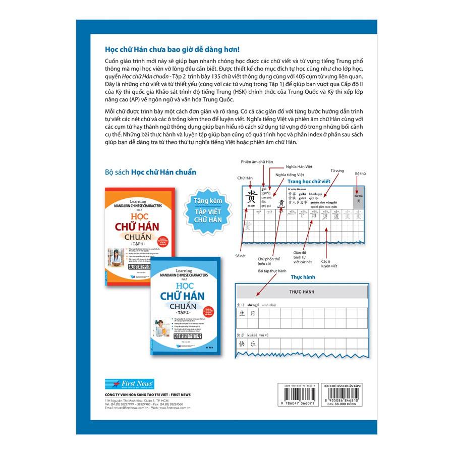 Bộ giáo trình mới này sẽ giúp bạn nhanh chóng học được các chữ viết và từ vựng tiếng Trung phổ thông mà mọi học viên vỡ lòng đều cần biết. Được thiết kế cho mục đích tự học cũng như cho lớp học, quyển Học chữ Hán chuẩn - tập 1 trình bày 178 Hán tự thông dụng cùng với 534 cụm từ vựng liên quan và 135 Hán tự thông dụng cùng với 405 cụm từ vựng liên quan ở Học chữ Hán chuẩn - tập 2. Đây là những chữ viết và từ thiết yếu để giúp bạn vượt qua cấp độ I của kỳ thi quốc gia khảo sát trình độ tiếng Trung (HSK) chính thức của Trung Quốc và kỳ thi xếp lớp nâng cao (AP) về ngôn ngữ và văn hóa Trung Quốc.
