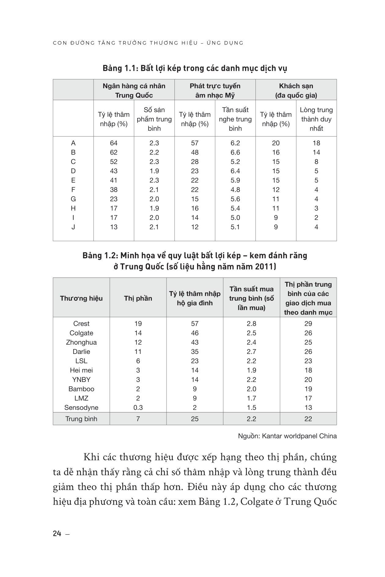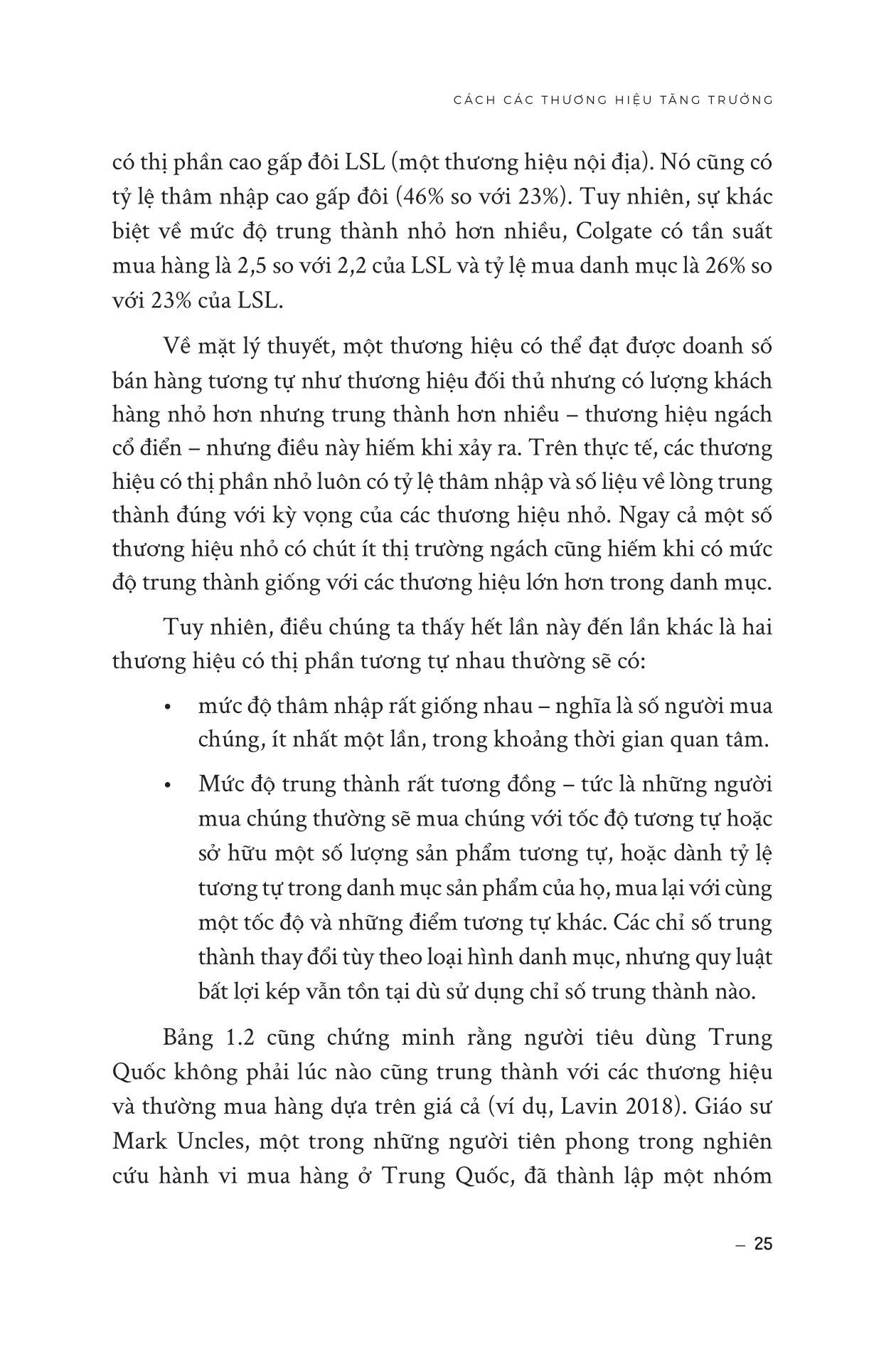 - Tập trung vào các hoạt động marketing định kỳ, như quảng cáo liên tục và khuyến mãi, để giữ chân khách hàng hiện có. Cuốn sách này có gì đặc biệt? Đầu tiên, cuốn sách giúp độc giả hiểu rõ hơn về cách các khách hàng thực sự mua hàng và tương tác với thương hiệu. Các nhà quản lý sẽ học được cách phát hiện ra các yếu tố quan trọng trong quá trình mua hàng và cách thiết lập mối quan hệ với khách hàng của m.ình. Thứ hai, cuốn sách chỉ ra các công cụ và phương pháp nghiên cứu giúp độc giả hiểu rõ hơn về thị trường và khách hàng của họ, đồng thời đánh giá các yếu tố ảnh hưởng đến quyết định mua hàng của khách hàng cũng như cách tạo ra trải nghiệm khách hàng tốt nhất để tăng trưởng doanh số bán hàng. Cuối cùng, cuốn sách mang lại cho độc giả một cái nhìn toàn diện về tăng trưởng thương hiệu và doanh số bán hàng không chỉ trong các thị trường phát triển mà còn ở các thị trường mới nổi, dịch vụ, hàng tiêu dùng, B2B và thương hiệu sang trọng. Các độc giả sẽ học được cách phát triển chiến lược marketing hiệu quả và tăng trưởng doanh số bán hàng trong nhiều loại hình thị trường khác nhau. Cuốn sách này dành cho ai? Cuốn sách hướng tới độc giả là các nhà quản lý thương hiệu, các chuyên gia marketing, các nhà nghiên cứu cũng như những người cần giải quyết các công việc liên quan đến tăng trưởng thương hiệu và phát triển chiến lược marketing hiệu quả. Các độc giả mong muốn có thêm các kiến thức và phương pháp để phát triển chiến lược marketing và tăng trưởng doanh số bán hàng. Cuốn sách giúp các độc giả hiểu rõ hơn về các yếu tố quan trọng để thu hút khách hàng mới và giữ chân khách hàng hiện có, cũng như đưa ra các khuyến nghị cụ thể về cách tăng trưởng thương hiệu trong các thị trường mới nổi, dịch vụ, hàng tiêu dùng, B2B và thương hiệu xa xỉ. Giới thiệu về tác giả Giáo sư Byron Sharp là Giám đốc Viện Khoa học Tiếp thị Ehrenberg-Bass tại Đại học Nam Úc. Nghiên cứu cơ bản của Viện được sử dụng và hỗ trợ tài chính bởi nhiều tập đoàn hàng đầu thế giới bao gồm Coca-Cola, Kraft, Kellogg's, British Airways, Procter & Gamble, Nielsen, TNS, Turner Broadcasting, Network Ten, Simplot, Mars và nhiều tập đoàn khác. Tiến sĩ Sharp đã xuất bản hơn 100 bài báo học thuật và là thành viên ban biên tập của năm tạp chí. Gần đây, ông đồng tổ chức một hội nghị tại Trường Kinh doanh Wharton về luật quảng cáo và cùng với Giáo sư Jerry Wind, đang biên tập một số đặc biệt của Tạp chí Nghiên cứu Quảng cáo về chủ đề này. Giáo sư Jenni Romaniuk là Phó Giám đốc (Quốc tế) của Viện Ehrenberg-Bass, Đại học Nam Úc. Trước đây, Jenni là biên tập viên điều hành của Tạp chí Nghiên cứu Quảng cáo, và hiện là thành viên Ban Cố vấn Cấp cao của Tạp chí. Đánh giá về cuốn sách “Nếu đã đọc và yêu thích Con đường tăng trưởng thương hiệu phần 2, đã đến lúc bạn cần chuyển sang cấp độ tiếp thị cao hơn. Và nếu chưa đọc, hãy chuẩn bị sẵn sàng -- cuốn sách này sẽ thay đổi cách bạn tư duy về tiếp thị mãi mãi.” - Goodreads “Đây là cuốn sách không thể bỏ qua đối với bất kỳ ai đang làm việc trong lĩnh vực Tiếp thị và Xây dựng Thương hiệu. Nếu bạn dày dạn kinh nghiệm, hãy từ những gì bạn NGHĨ bạn biết và đọc cuốn sách này.” - Henry Manampiring, tác giả