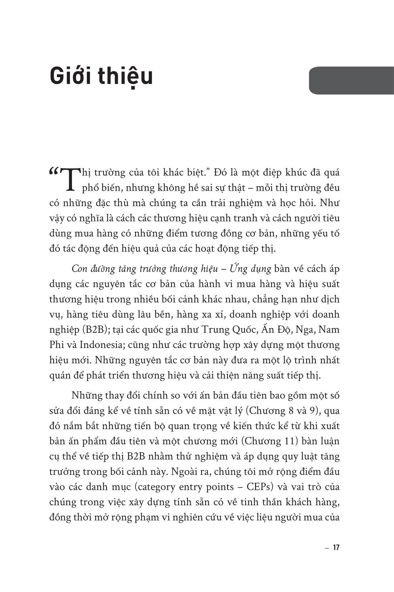 Cuối cùng, cuốn sách mang lại cho độc giả một cái nhìn toàn diện về tăng trưởng thương hiệu và doanh số bán hàng không chỉ trong các thị trường phát triển mà còn ở các thị trường mới nổi, dịch vụ, hàng tiêu dùng, B2B và thương hiệu sang trọng. Các độc giả sẽ học được cách phát triển chiến lược marketing hiệu quả và tăng trưởng doanh số bán hàng trong nhiều loại hình thị trường khác nhau.