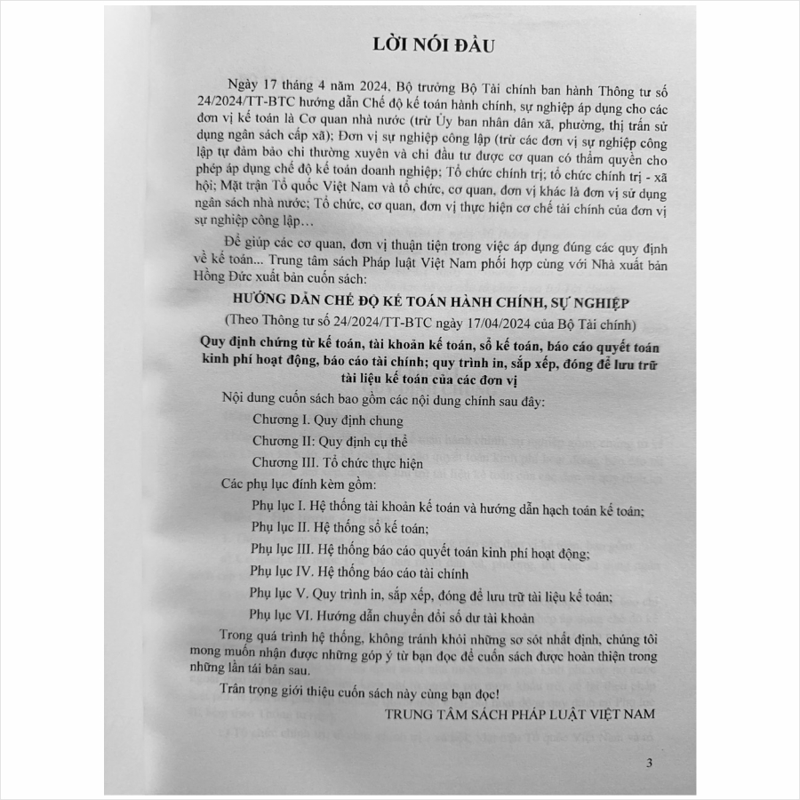 - Toàn bộ sách bìa mềm khổ lớn 19 x 27 cm phân phối bởi Nhà sách Nam Việt đều được bọc sách Plastic MIỄN PHÍ và xuất hóa đơn điện tử đầy đủ, nhanh chóng. …/… Lời giới thiệu: Ngày 17 tháng 4 năm 2024, Bộ Tài chính ban hành Thông tư số 24/2024/TT-BTC hướng dẫn Chế độ kế toán hành chính, sự nghiệp gồm: chứng từ kế toán, tài khoản kế toán, sổ kế toán, báo cáo quyết toán kinh phí hoạt động, báo cáo tài chính; quy trình in, sắp xếp, đóng để lưu trữ tài liệu kế toán của các đơn vị. Đối tượng được áp dụng cho các đơn vị kế toán, bao gồm: Cơ quan nhà nước (trừ Ủy ban nhân dân xã, phường, thị trấn sử dụng ngân sách cấp xã); Đơn vị sự nghiệp công lập; Tổ chức chính trị; tổ chức chính trị – xã hội; Mặt trận Tổ quốc Việt Nam và tổ chức, cơ quan, đơn vị khác là đơn vị sử dụng ngân sách nhà nước; Tổ chức, cơ quan, đơn vị thực hiện cơ chế tài chính của đơn vị sự nghiệp công lập. Nhằm phổ biến đến Quý Cơ quan, Đơn vị và Quý khách hàng thân thiết nắm bắt kịp thời những quy định mới nêu trên. Nhà sách Nam Việt xin trân trọng giới thiệu cuốn sách: HƯỚNG DẪN HƯỚNG DẪN CHẾ ĐỘ KẾ TOÁN HÀNH CHÍNH, SỰ NGHIỆP theo Thông tư số 24/2024/TT-BTC ngày 17 tháng 4 năm 2024 của Bộ Tài chính .../... Nội dung cuốn sách gồm có các phụ lục sau: Phụ lục I. HỆ THỐNG TÀI KHOẢN KẾ TOÁN VÀ HƯỚNG DẪN HẠCH TOÁN KẾ TOÁN; Phụ lục II. HỆ THỐNG SỔ KẾ TOÁN; Phụ lục III. HỆ THỐNG BÁO CÁO QUYẾT TOÁN KINH PHÍ HOẠT ĐỘNG; Phụ lục IV. HỆ THỐNG BÁO CÁO TÀI CHÍNH Phụ lục V. QUY TRÌNH IN, SẮP XẾP, ĐÓNG ĐỂ LƯU TRỮ TÀI LIỆU KẾ TOÁN; ...//... Cảm ơn các bạn đã ghé thăm shop Nhà sách Nam Việt ! Sách HƯỚNG DẪN HƯỚNG DẪN CHẾ ĐỘ KẾ TOÁN HÀNH CHÍNH, SỰ NGHIỆP theo Thông tư số 24/2024/TT-BTC ngày 17 tháng 4 năm 2024 của Bộ Tài chính Sách HƯỚNG DẪN HƯỚNG DẪN CHẾ ĐỘ KẾ TOÁN HÀNH CHÍNH, SỰ NGHIỆP theo Thông tư số 24/2024/TT-BTC ngày 17 tháng 4 năm 2024 của Bộ Tài chính