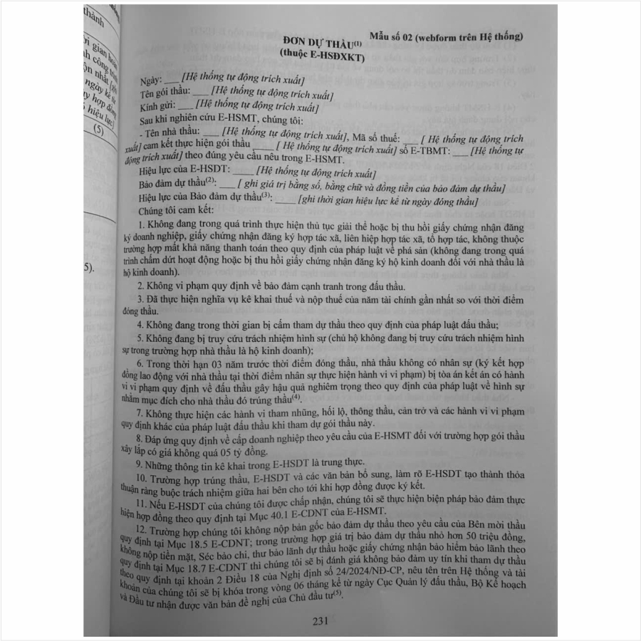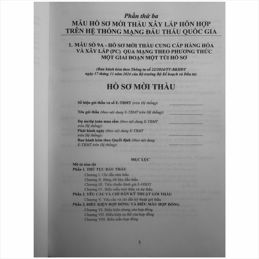 - Toàn bộ sách bìa mềm khổ lớn 20 x 28 cm phân phối bởi Nhà sách Nam Việt đều được bọc sách Plastic MIỄN PHÍ và xuất hóa đơn điện tử đầy đủ, nhanh chóng. …/… Lời giới thiệu: Ngày 17/11/2024, Bộ Kế hoạch và Đầu tư đã ban hành Thông tư số 22/2024/TT-BKHĐT hướng dẫn việc cung cấp, đăng tải thông tin về lựa chọn nhà thầu và mẫu hồ sơ đấu thầu trên Hệ thống mạng đấu thầu quốc gia. Thông tư 22/2024/TT-BKHĐT là một văn bản pháp luật quan trọng, đánh dấu bước tiến mới trong việc quản lý và điều hành các hoạt động đấu thầu, thúc đẩy việc minh bạch và hiệu quả trong lĩnh vực đấu thầu tại Việt Nam. Thông tư 22/2024/TT-BKHĐT cung cấp 42 mẫu hồ sơ chuẩn hóa (Từ Mẫu 1A tới Mẫu 14D) và 17 phụ lục (Từ Phụ lục 1A- Phụ lục 10), chính thức có hiệu lực từ 01/01/2025 (một phần hiệu lực từ 01/12/2024). Để kịp thời đáp ứng nhu cầu thông tin của các cơ quan, ban, ngành cùng các nhà thầu, nhà đầu tư và đông đảo bạn đọc trong cả nước về các quy định pháp luật mới trong lĩnh vực đấu thầu, Nhà sách Nam Việt xin trân trọng giới thiệu cuốn sách: Hướng Dẫn Cung Cấp, Đăng Tải Thông Tin Về Lựa Chọn Nhà Thầu Và Mẫu Hồ Sơ Đấu Thầu Trên Hệ Thống Mạng Đấu Thầu Quốc Gia – Tuyển Tập Mẫu Hồ Sơ Mời Thầu Xây Lắp (tập 2) …//… Nội dung quyển 2 gồm các nội dung sau: MẪU SỐ 9A. Hồ Sơ Mời Thầu Cung Cấp Hàng Hóa Và Xây Lắp (PC) Qua Mạng Theo Phương Thức Một Giai Đoạn Một Túi Hồ Sơ MẪU SỐ 9B. Hồ Sơ Mời Thầu Cung Cấp Hàng Hóa Và Xây Lắp Qua Mạng Theo Phương Thức Một Giai Đoạn Hai Túi Hồ Sơ MẪU SỐ 9C. Hồ Sơ Mời Sơ Tuyển Cung Cấp Hàng Hóa Và Xây Lắp (PC) Qua Mạng MẪU SỐ 10A. Hồ Sơ Mời Thầu Thiết Kế, Cung Cấp Hàng Hóa Và Xây Lắp (EPC) Qua Mạng Một Giai Đoạn Một Túi Hồ Sơ MẪU SỐ 10B. Hồ Sơ Mời Thầu Thiết Kế, Cung Cấp Hàng Hóa Và Xây Lắp (EPC) Qua Mạng Một Giai Đoạn Hai Túi Hồ Sơ MẪU SỐ 10C. Hồ Sơ Mời Sơ Tuyển Thiết Kế, Cung Cấp Hàng Hóa Và Xây Lắp (EPC) Qua Mạng …//… Quý khách tham khảo thêm nội dung quyển 1 như sau: MẪU SỐ 3A. Hồ Sơ Mời Thầu Xây Lắp Qua Mạng Một Giai Đoạn Một Túi Hồ Sơ MẪU SỐ 3B. Hồ Sơ Mời Thầu Xây Lắp Qua Mạng Một Giai Đoạn Hai Túi Hồ Sơ MẪU SỐ 3C. Hồ Sơ Mời Sơ Tuyển Xây Lắp Qua Mạng MẪU SỐ 8A. Hồ Sơ Mời Thầu Thiết Kế Và Xây Lắp (EC) Qua Mạng Một Giai Đoạn Một Túi Hồ Sơ MẪU SỐ 8B. Hồ Sơ Mời Thầu Thiết Kế Và Xây Lắp (EC) Qua Mạng Một Giai Đoạn Hai Túi Hồ Sơ MẪU SỐ 8C. Hồ Sơ Mời Sơ Tuyển Thiết Kế Và Xây Lắp (EC) Qua Mạng *** Quý khách hàng hãy an tâm khi mua sách tại Nhà sách Nam Việt, cam kết uy tín, chất lượng, sách bản gốc chuẩn đẹp, được kiểm hàng, hài lòng mới thanh toán, sách đã được bọc plastic cao cấp miễn phí! .../... Cảm ơn các bạn đã ghé thăm shop Nhà sách Nam Việt ! Sách Hướng Dẫn Cung Cấp, Đăng Tải Thông Tin về Lựa chọn Nhà Thầu và Mẫu Hồ Sơ Đấu Thầu Trên Hệ Thống Mạng Đấu Thầu Quốc Gia – Thông tư 22/2024/TT-BKHĐT (Quyển 2) Sách Hướng Dẫn Cung Cấp, Đăng Tải Thông Tin về Lựa chọn Nhà Thầu và Mẫu Hồ Sơ Đấu Thầu Trên Hệ Thống Mạng Đấu Thầu Quốc Gia – Thông tư 01/2024/TT-BKHĐT (Quyển 2)