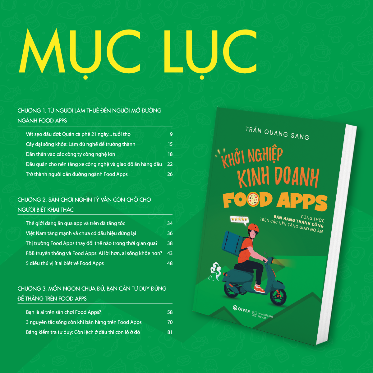 Cuốn sách gồm 8 chương, dẫn dắt người đọc từ tư duy nền tảng đến các kỹ năng thực chiến, giúp bất kỳ ai, kể cả người từng thất bại, có thể khởi nghiệp thành công và làm giàu trên các nền tảng giao đồ ăn như G.r.a.b Food, S.h.o.p.e.e Food…