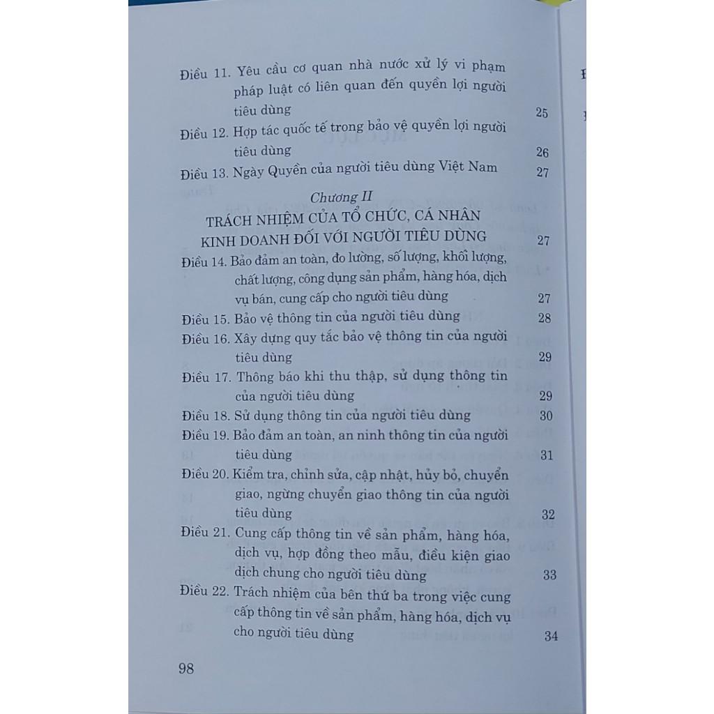 Mua tại TiktokSách - Luật Bảo Vệ Quyền Lợi Người Tiêu Dùng Tác giả: Quốc Hội Nhà xuất bản: Chính Trị Quốc Gia Sự Thật Ngày xuất bản: Tháng 08/ 2023 Số trang:103 trang Khổ sách: 13x19 cm Công ty phát hành: Nhà Sách Tư Pháp Giá bìa: 24.000đ Hình thức bìa: bìa mềm Lời giới thiệu: Luật Bảo Vệ Quyền Lợi Người Tiêu Dùng 2023 (Luật số: 19/2023/QH15) Luật này được Quốc hội nước Cộng hòa xã hội chủ nghĩa Việt Nam khóa XV, kỳ họp thứ 5 thông qua ngày 20 tháng 6 năm 2023 gồm 7 Chương, 82 Điều có hiệu lực thi hành ngày 01-07-2024