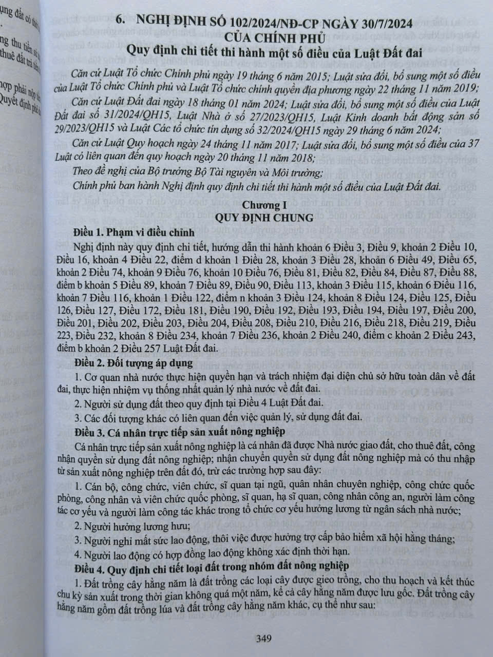 – Nghị định số 102/2024/NĐ-CP ngày 30 tháng 7 năm 2024 của Chính phủ Quy định chi tiết thi hành một số điều của Luật Đất đai 2024
