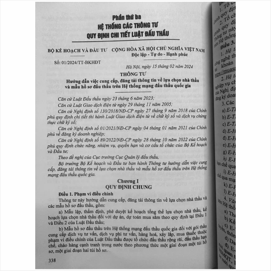– Thông tư số 01/2024/TT-BKHĐT ngày 15 tháng 02 năm 2024 của Bộ Kế hoạch và Đầu tư hướng dẫn việc cung cấp, đăng tải thông tin về lựa chọn nhà thầu và mẫu hồ sơ đấu thầu trên Hệ thống mạng đấu thầu quốc gia;
