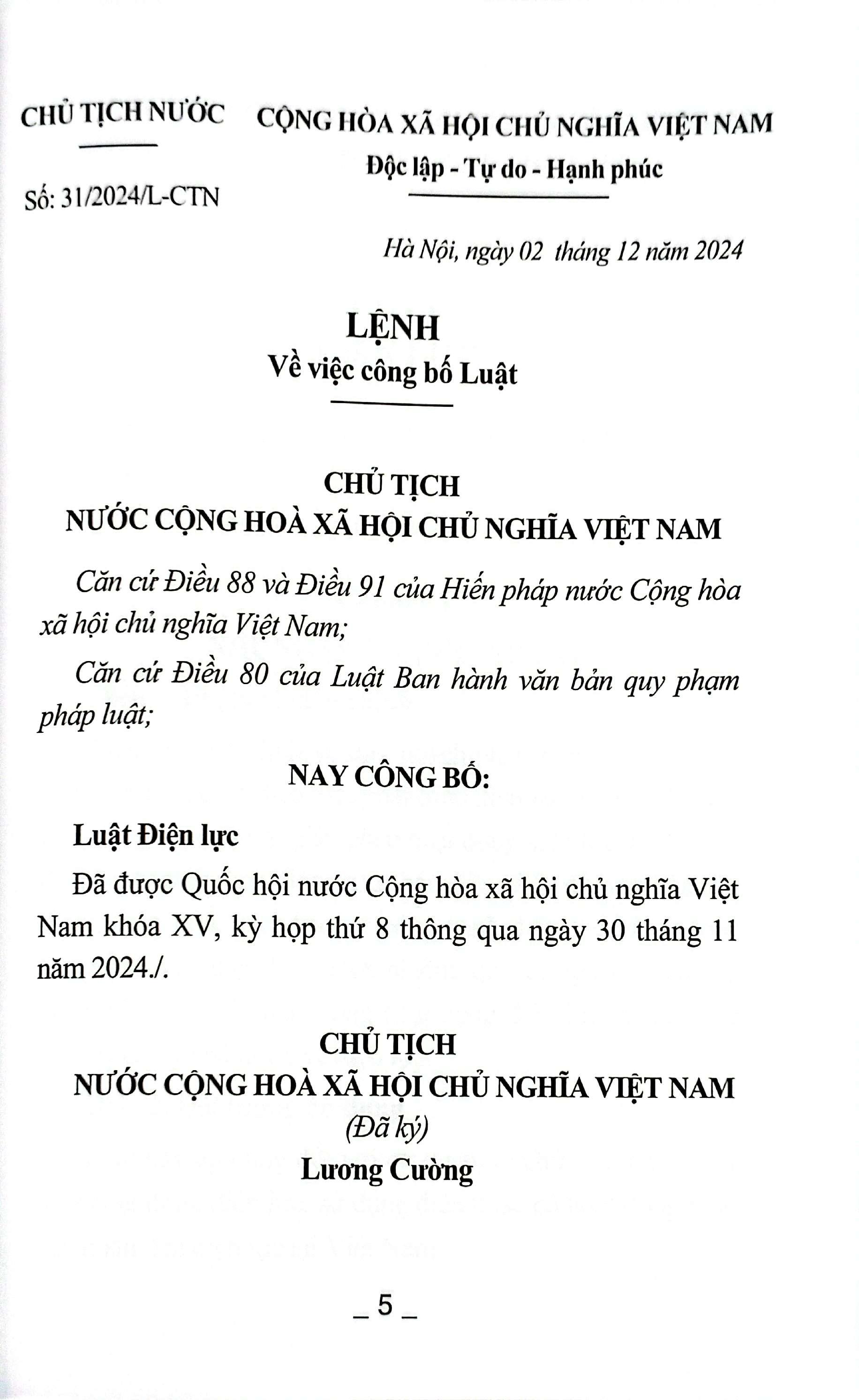 Luật Điện Lực - Hệ Thống Văn Bản Quy Định, Hướng Dẫn Chi Tiết Thi Hành Ngày 30/11/2024, tại Kỳ họp thứ 8, Quốc hội khóa XV đã thông qua Luật Điện lực (sửa đổi)