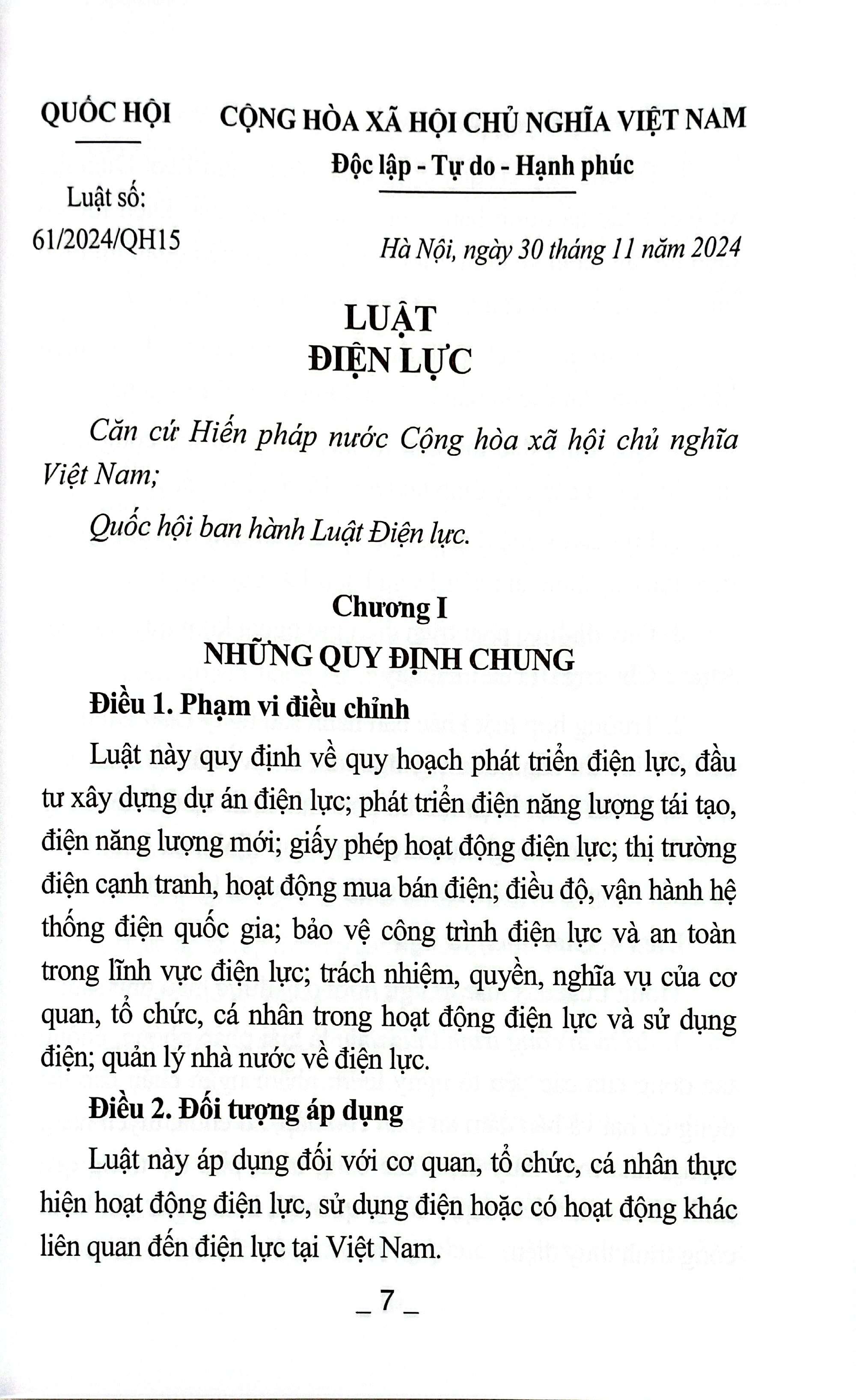 Ngày 30/11/2024, Quốc hội đã thông qua Luật Điện lực số 61/2024/QH15. Theo đó, Luật có một số nội dung đáng chú ý: Giá bán điện thực hiện theo cơ chế thị trường có sự điều tiết giá của Nhà nước phù hợp với cấp độ thị trường điện cạnh tranh; Giảm dần, tiến tới xóa bỏ bù chéo giá điện; Chính sách phát triển điện vùng nông thôn, vùng đồng bào dân tộc thiểu số, miền núi, biên giới, hải đảo và vùng có điều kiện kinh tế - xã hội đặc biệt khó khăn; Nhà nước sẽ thực hiện hỗ trợ tiền điện;... Luật này có hiệu lực kể từ ngày 01/02/2025.