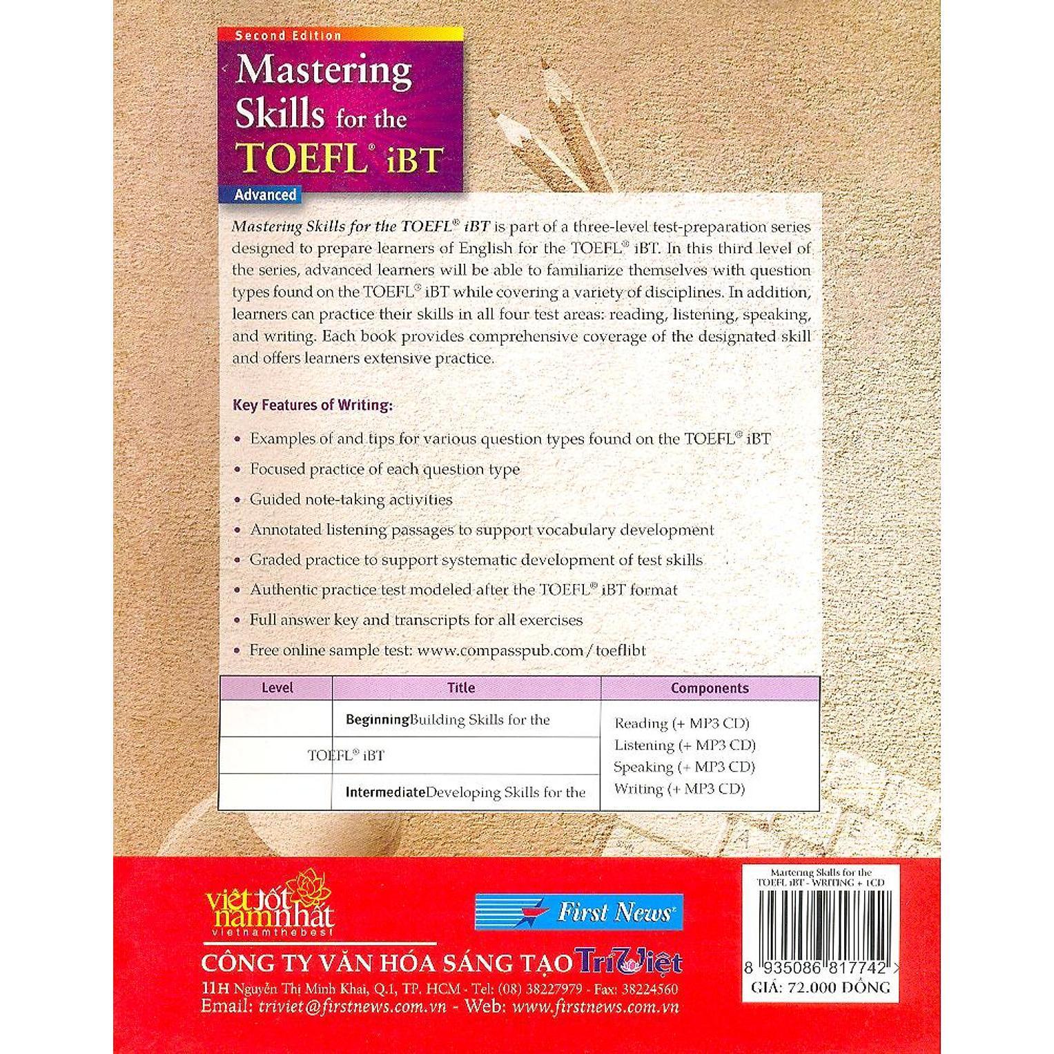 mang đến một giáo trình hợp lý và khoa học giúp người học nâng cao kỹ năng viết thông qua các bài tập theo mức độ phức tạp tăng dần. Các chương sẽ được chia ra từng phần độc lập ngày và bài tập, mức độ khó sẽ tăng dần lên. Trong mỗi phần, bạn sẽ được hướng dẫn những academic words nhằm đạt điểm cao. Không chỉ dừng lại ở đó, sau mỗi essay, cuốn sách lại tóm tắt các academic words đó giúp bạn đọc hiểu rõ cách dùng của chúng và nêu ra các từ nghĩa tương đương để tránh lặp từ trong bài viết. Sau 1 thời gian ôn tập, trình độ về viết của bạn sẽ được nâng cao với các bài cọ xát theo đúng chuẩn của kì thi Toefl, người học có thể tự rút kinh nghiệm cho chính bản thân mình trong suốt quá trình luyện tập. Đây là cuốn cẩm nang cần thiết cho những ai muốn đạt kết quả cao trong kì thi.
