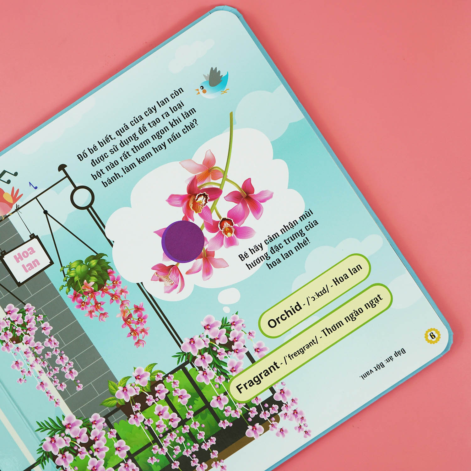 Điểm độc đáo của Sách mùi hương nằm ở các tem mùi hương được gắn kèm trong mỗi trang sách. Trẻ và bố mẹ có thể chà sát nhẹ tem mùi hương để ngửi mùi hương của các loại hoa và quả.