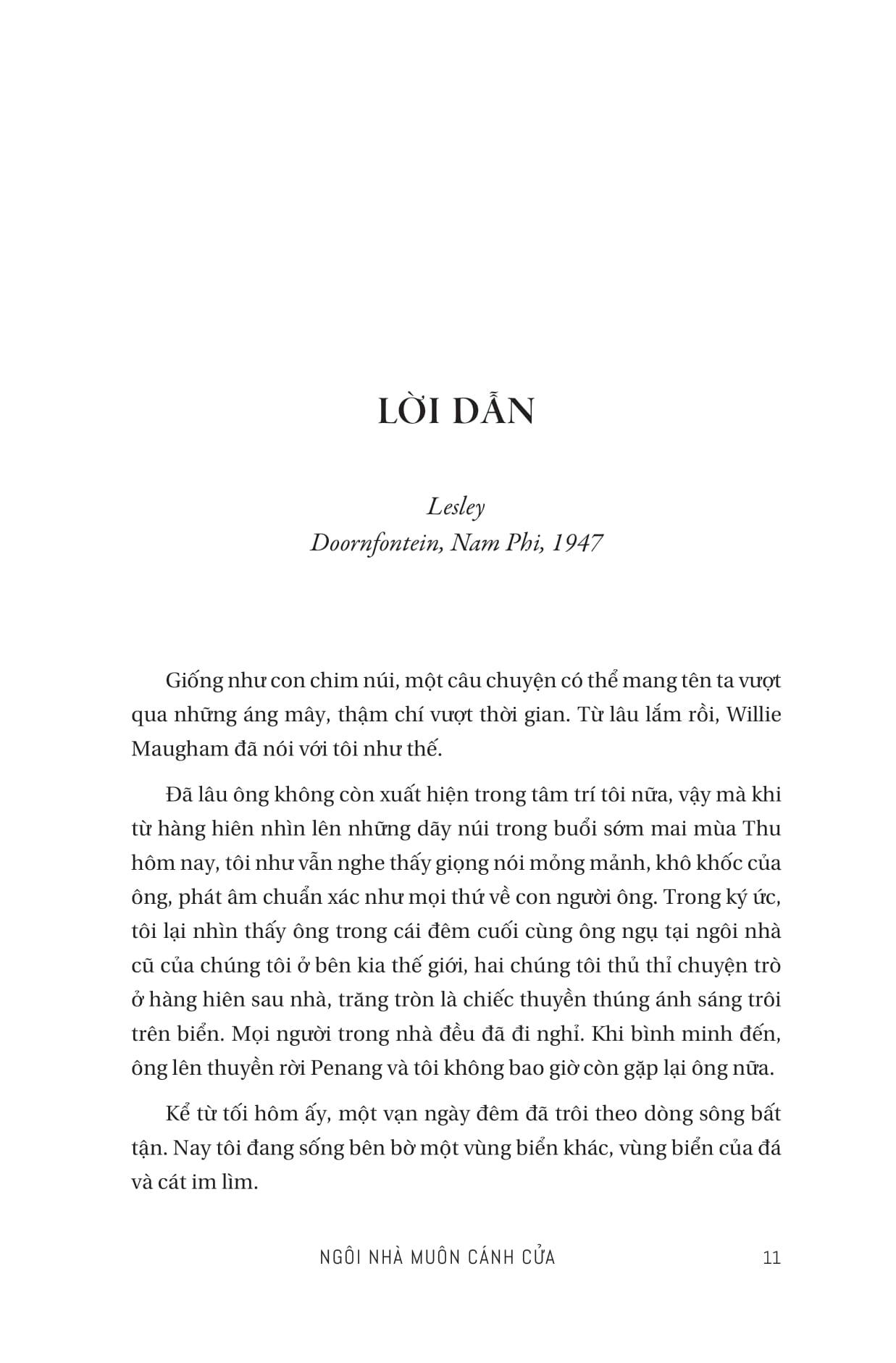 “Ngôi nhà muôn cánh cửa” không chỉ liên quan đến chiến tranh và cách mạng, đến hôn nhân và bê bối, mà còn là câu chuyện của những đứt gãy c.hủng tộc, giới tính, khuynh hướng tính dục và quyền lực, liên tục đào sâu vào bản chất phức tạp của tình yêu và tình bạn, của trung thành và bội phản. Câu chuyện diễn ra tại Khu định cư Eo biển Penang, Mã Lai năm 1921, khi Lesley Hamlyn cùng chồng chuẩn bị đón tiếp “Willie” Somerset Maugham − văn sĩ lừng danh và cũng là bạn cũ của chồng bà. Đâu ai biết chuyến thăm ấy sẽ thay đổi cuộc sống của nhiều người. Maugham − một trong những tiểu thuyết gia vĩ đại nhất thời bấy giờ − đang rơi vào khánh kiệt, sự nghiệp xuống dốc, sức khỏe sa sút, ráo riết đi tìm chủ đề mới cho cuốn sách tiếp theo của m.ình. Cùng lúc đó, Lesley đang phải chịu đựng cuộc hôn nhân trên bờ vực đổ vỡ. Tình cờ biết được mối quan hệ trong quá khứ của Lesley với nhà cách mạng Trung Quốc Tôn Dật Tiên, Maugham quyết định điều tra sâu hơn và tưởng như chủ đề cho tác phẩm tiếp theo đã xuất hiện. Thế nhưng, khi tình bạn giữa hai người phát triển và Lesley tâm sự với ông về cuộc sống ở Eo biển Penang, Maugham phát hiện ra một câu chuyện còn bất ngờ hơn nhiều so với những gì ông tưởng... “Giống như con chim núi, một câu chuyện có thể mang tên ta vượt qua những áng mây, thậm chí vượt thời gian.”