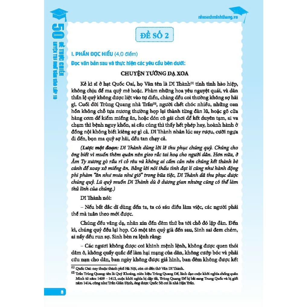 Kì thi vào lớp 10 – cột mốc quan trọng đầu tiên trên hành trình học tập – không chỉ đòi hỏi kiến thức vững vàng mà còn cần sự chuẩn bị có định hướng, sát thực tế. Cuốn sách “50 Đế thực chiến luyện thi Ngữ văn vào lớp 10" được biên soạn với mục tiêu hỗ trợ học sinh chủ động ôn tập, rèn luyện kĩ năng và tự tin bước vào kì thi.