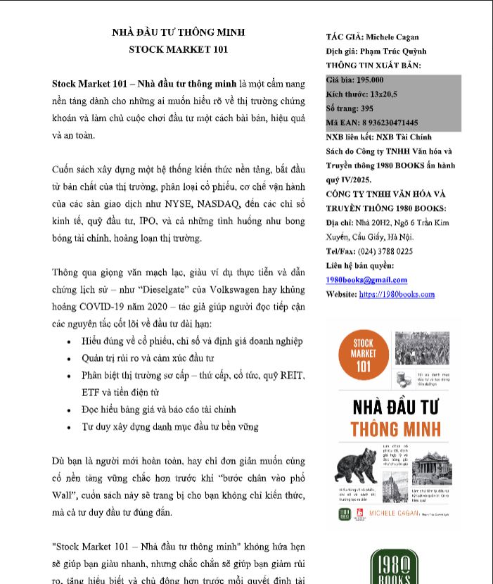 Mua tại TiktokGiới thiệu ngắn: "Stock Market 101 – Nhà đầu tư thông minh" là cuốn sách nhập môn toàn diện, giúp người đọc hiểu rõ cách thị trường chứng khoán vận hành, từ đó đưa ra quyết định đầu tư bài bản và hiệu quả. Nội dung dễ hiểu, giàu ví dụ thực tiễn, phù hợp cho người mới bắt đầu hoặc người đang tìm kiếm tư duy đầu tư vững chắc. USP: