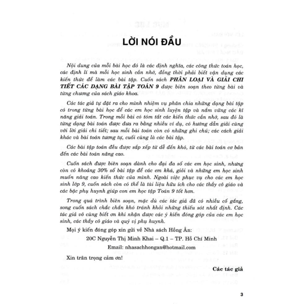 Nội dung của mỗi bài học đó là các định nghĩa, các công thức toán học, các định lí mà mỗi học sinh cần nhớ, đồng thời phải biết vận dụng các kiến thức để làm các bài tập. Cuốn sách PHÂN LOẠI VÀ GIẢI CHI TIẾT CÁC DẠNG BÀI TẬP TOÁN 9 được biên soạn theo từng bài và từng chương của sách giáo khoa.