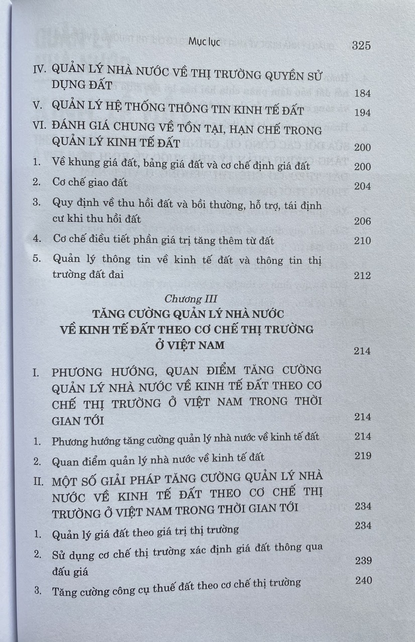 Cuốn sách " QUẢN LÝ NHÀ NƯỚC VỀ KINH TẾ ĐẤT THEO CƠ CHẾ THỊ TRƯỜNG Ở VIỆT NAM" nội dung trong cuốn sách đề cập những vấn đề lý luận chung về quản lý nhà nước về kinh tế đất theo cơ chế thị trường trong điều kiện sở hữu toàn dân về đất đai, khai thác nguồn thu từ đất, kinh nghiệm của các nước trên thế giới về quản lý kinh tế đất, điều tiết giá trị gia tăng, khai thác thu từ đất và bài học rút ra cho Việt Nam; đánh giá thực trạng quản lý nhà nước về giá đất, chính sách kinh tế trong quản lý đất đai, chính sách và công cụ thuế, phí, lệ phí trong quản lý nhà nước về kinh tế đất, quản lý nhà nước về thị trường quyền sử dụng đất, quản lý hệ thống thông tin kinh tế đất,... Qua đó nhóm tác giả đã mạnh dạn đề xuất các giải pháp để tăng cường quản lý kinh tế đất, khai thác nguồn thu từ đất theo cơ chế thị trường với những nội dung cần sửa đổi, bổ sung Luật Đất đai năm 2013 về quản lý và sử dụng công cụ giá đất theo cơ chế thị trường; quản lý và sử dụng công cụ thuế đất theo cơ chế thị trường; hoàn thiện chính sách giao đất, cho thuê đất, thu hồi và bồi thường khi thu hồi đất đảm bảo phân chia hài hòa lợi ích giữa các bên và tăng cường nguồn thu từ đất; hoàn thiện quản lý hệ thống thông tin về kinh tế đất;...