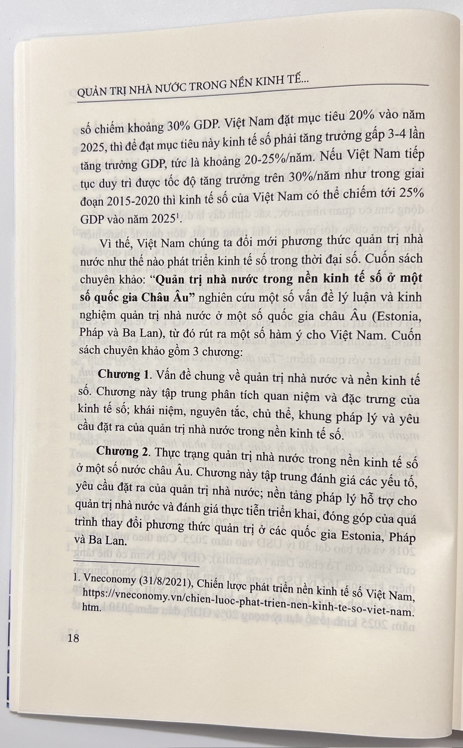 - Chương 2: Thực trạng quản trị nhà nước trong nền kinh tế số ở một số nước Châu Âu. Chương này tập trung đánh giá các yếu tố, yêu cầu đặt ra của quản trị nhà nước; nền tảng pháp lý hỗ trợ cho quản trị nhà nước và đánh giá thực tiễn triển khai, đóng góp của quá trình thay đổi phương thức quản trị ở các quốc gia Estonia, Pháp và Ba Lan.