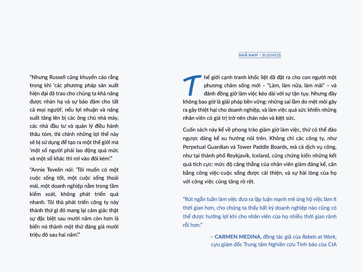 “Rút ngắn tuần làm việc đưa ra lập luận mạnh mẽ ủng hộ việc làm ít thời gian hơn, cho chúng ta thấy bất kỳ doanh nghiệp nào cũng có thể được hưởng lợi khi cho nhân viên của họ nhiều thời gian rảnh rỗi hơn."