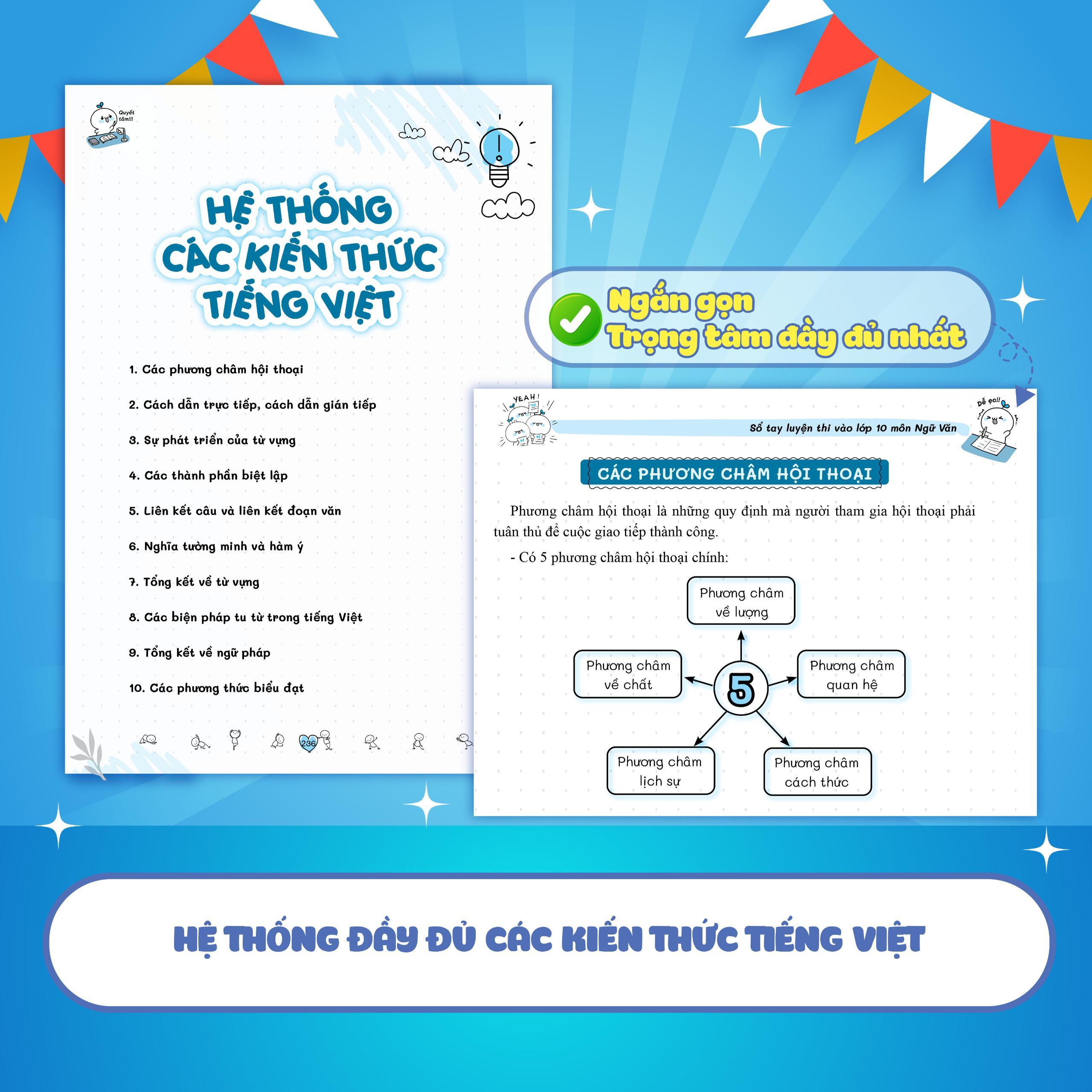 - Hệ thống đầy đủ các kiến thức tiếng Việt có kèm ví dụ minh họa cụ thể, giúp học sinh có cái nhìn tổng quát, dễ dàng nắm bắt và vận dụng. II. ƯU ĐIỂM NỔI BẬT CHỈ CÓ Ở SỔ TAY LUYỆN THI VÀO LỚP 10 MÔN TIẾNG ANH: