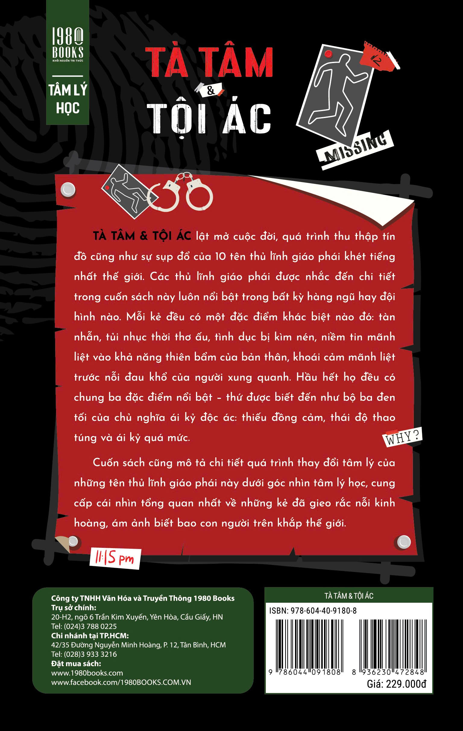 Với văn phong trực diện, giàu dữ liệu và phân tích sắc lạnh, Tà Tâm & Tội Ác không chỉ phù hợp với độc giả yêu thích điều tra, tội phạm, mà còn là tài liệu tham khảo thiết yếu cho những ai quan tâm đến tâm lý học tội phạm, hành vi cực đoan và cơ chế của thao túng xã hội.