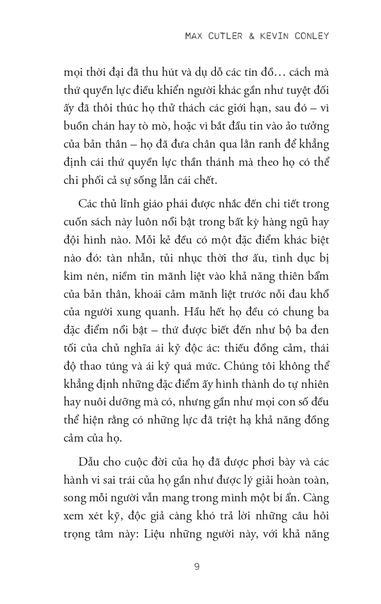Qua việc phân tích tâm lý và hành vi, cuốn sách chỉ ra những đặc điểm lặp đi lặp lại nơi các thủ lĩnh giáo phái: sự thiếu đồng cảm, ái kỷ bệnh hoạn, khả năng thao túng tinh vi. Dưới bàn tay họ, các tín đồ (thường là những người từng trải qua sang chấn, cô lập hoặc tuyệt vọng) trở thành công cụ thực hiện tội ác, nhân danh đức tin.