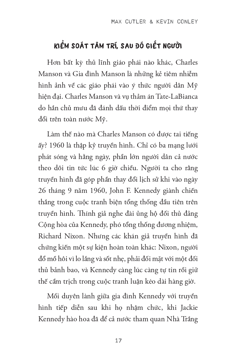 Cuốn sách được xây dựng dựa trên loạt podcast nổi tiếng Cults của Parcast – một trong những podcast dẫn đầu về đề tài giáo phái và tội phạm tâm lý học. Dưới góc nhìn cận tâm lý học và kể chuyện điều tra, Max Cutler và Kevin Conley tái hiện từng chi tiết trong cuộc đời và hành vi của các nhân vật như Charles Manson, Jim Jones, Keith Raniere, David Koresh,… những cái tên khiến cả thế giới rúng động bởi sự tàn nhẫn và khát vọng quyền lực không giới hạn.