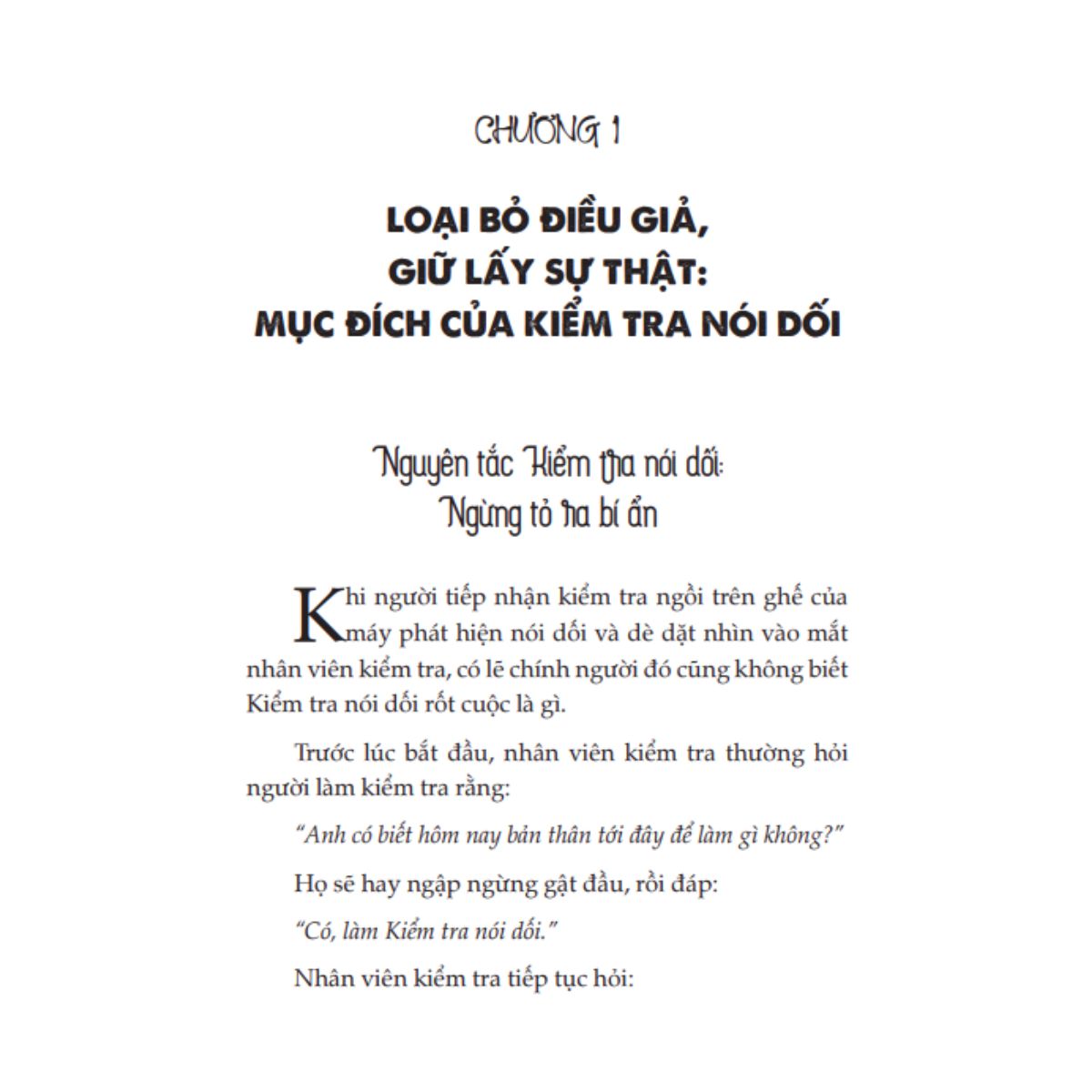 Tác giả chia sẻ những nguyên tắc cơ bản và quy trình kiểm tra nói dối, từ việc sử dụng máy phát hiện nói dối đến các kỹ thuật tâm lý để đánh giá độ tin cậy của lời nói. Cuốn sách không chỉ giải thích chi tiết về các chỉ số sinh lý được ghi lại trong quá trình kiểm tra, mà còn đưa ra những phân tích về tâm lý và hành vi của người nói dối.