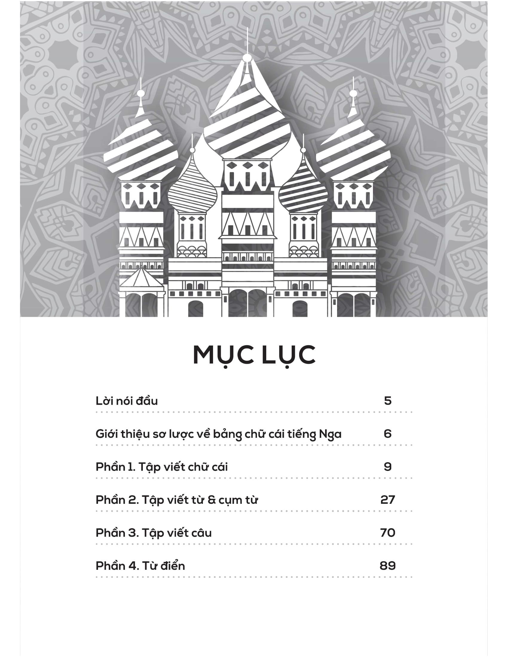 - Từ điển mini cuối sách giúp tra cứu và ghi nhớ từ vựng nhanh chóng. Trên đây là những nội dung nổi bật của cuốn sách mà chúng tôi muốn gửi đến bạn đọc – những ai đang bắt đầu hành trình chinh phục tiếng Nga từ những nét chữ đầu tiên. Hy vọng cuốn sách sẽ là người bạn đồng hành hữu ích, giúp bạn học dễ dàng, luyện viết hiệu quả và thêm yêu ngôn ngữ giàu văn hóa này. Chúc bạn học tốt và sớm đạt được mục tiêu của m.ình!