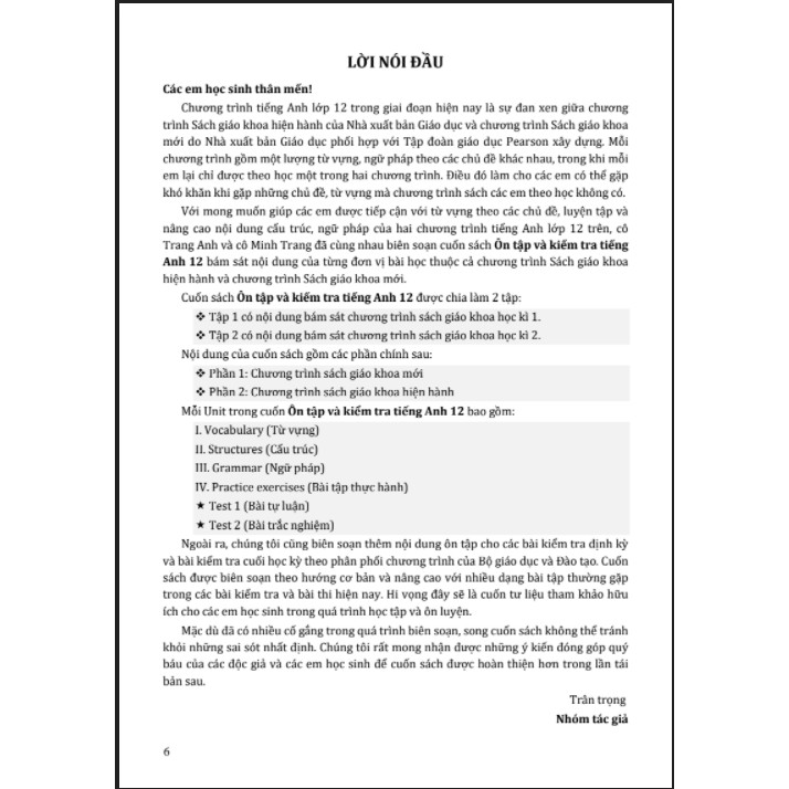 Với mong muốn giúp các em được tiếp cận với từ vựng theo các chủ đề, luyện tập và nâng cao nội dung cấu trúc, ngữ pháp của hai chương trình tiếng Anh lớp 12 nên cô Trang Anh và cô Minh Trang đã biên soạn cuốn sách Ôn tập và kiểm tra tiếng Anh 12 theo sát nội dung của từng đơn vị bài học trong chương trình sách giáo khoa của lớp 12 thuộc cả 2 chương trình là chương trình sách giáo khoa hiện hành và chương trình sách giáo khoa mới.