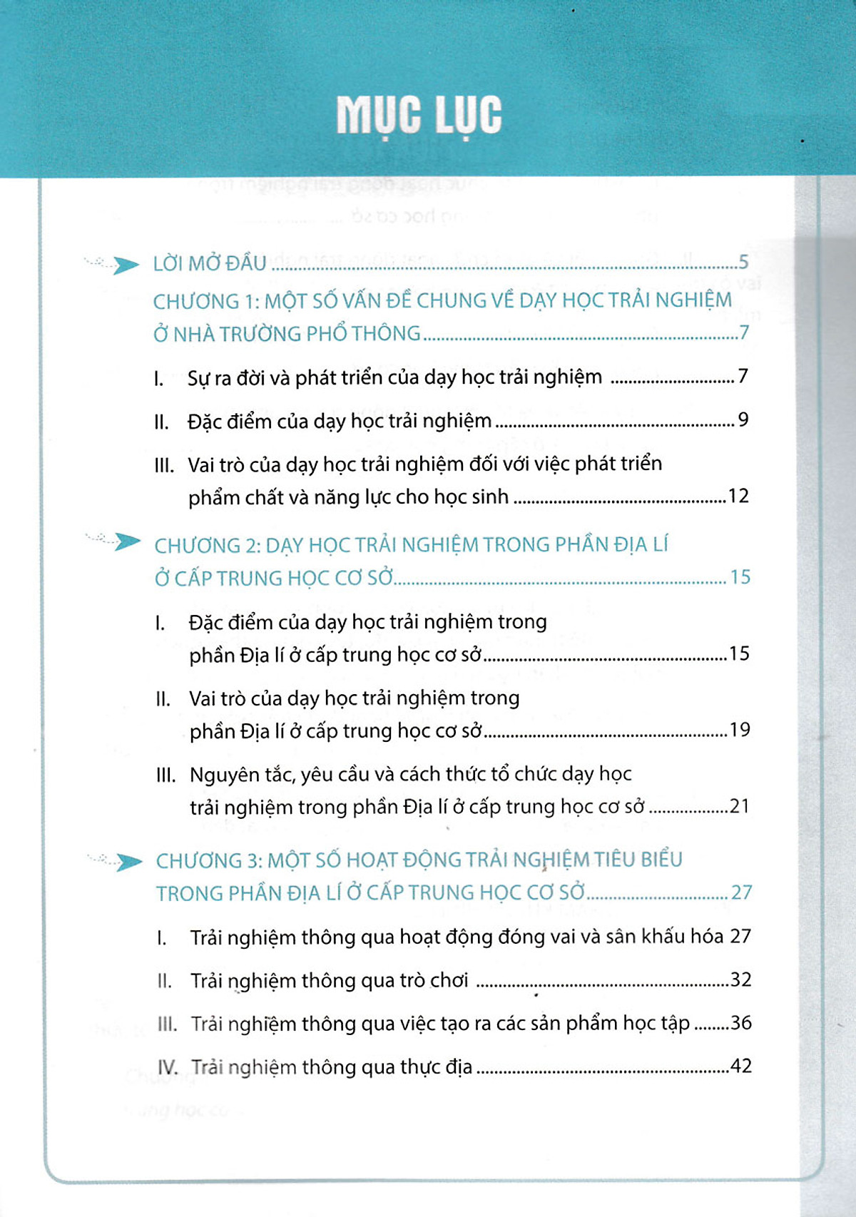 Chương 3. Một số hoạt động trải nghiệm tiêu biểu trong dạy học Địa lí ở cấp trung học cơ sở. Cuốn sách đã gợi ý một số hoạt động trải nghiệm có tính ứng dụng và mang lại hiệu quả cao trong dạy học Địa lí ở cấp trung học cơ sở như đóng vai, trò chơi, sân khấu, thực địa