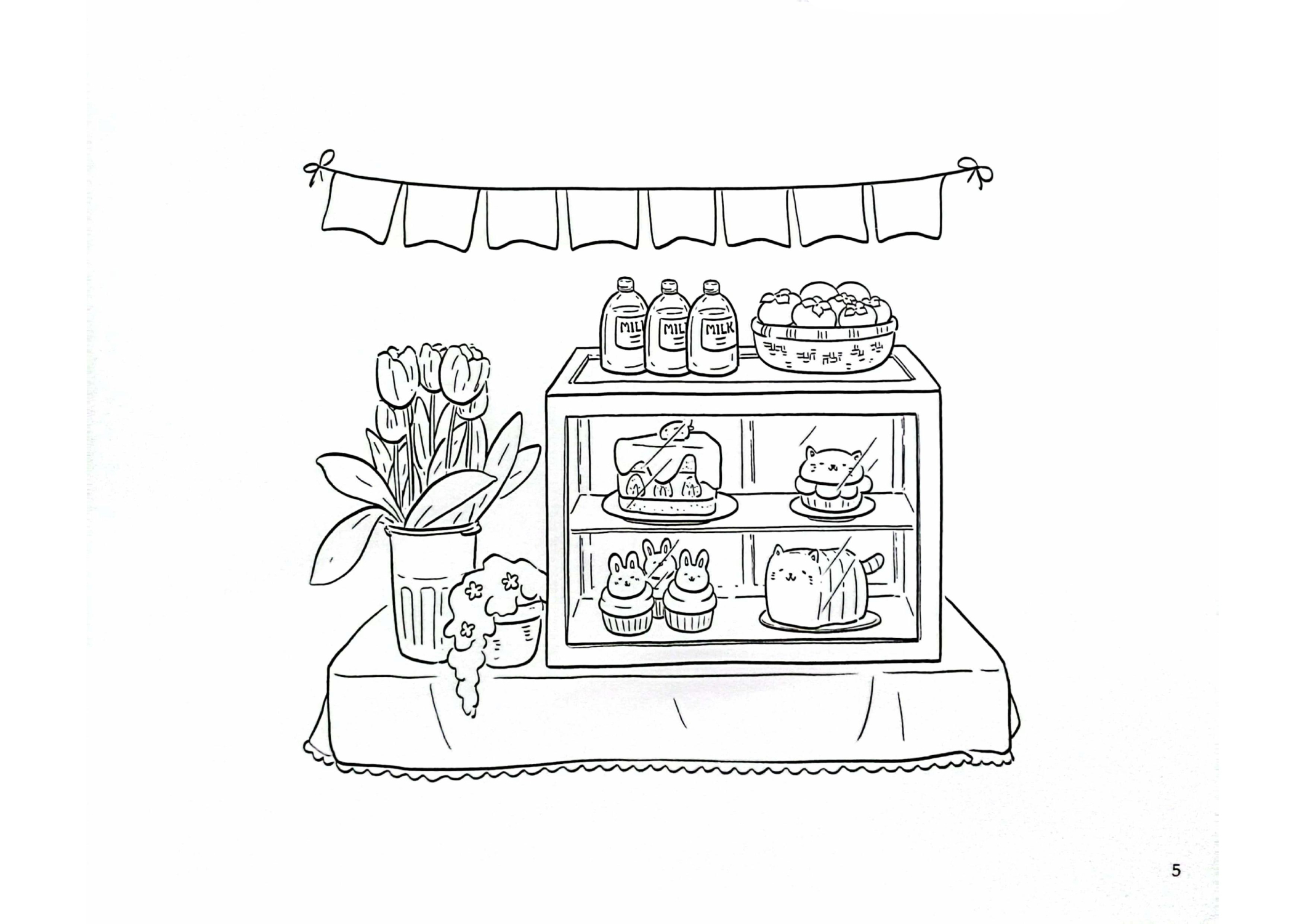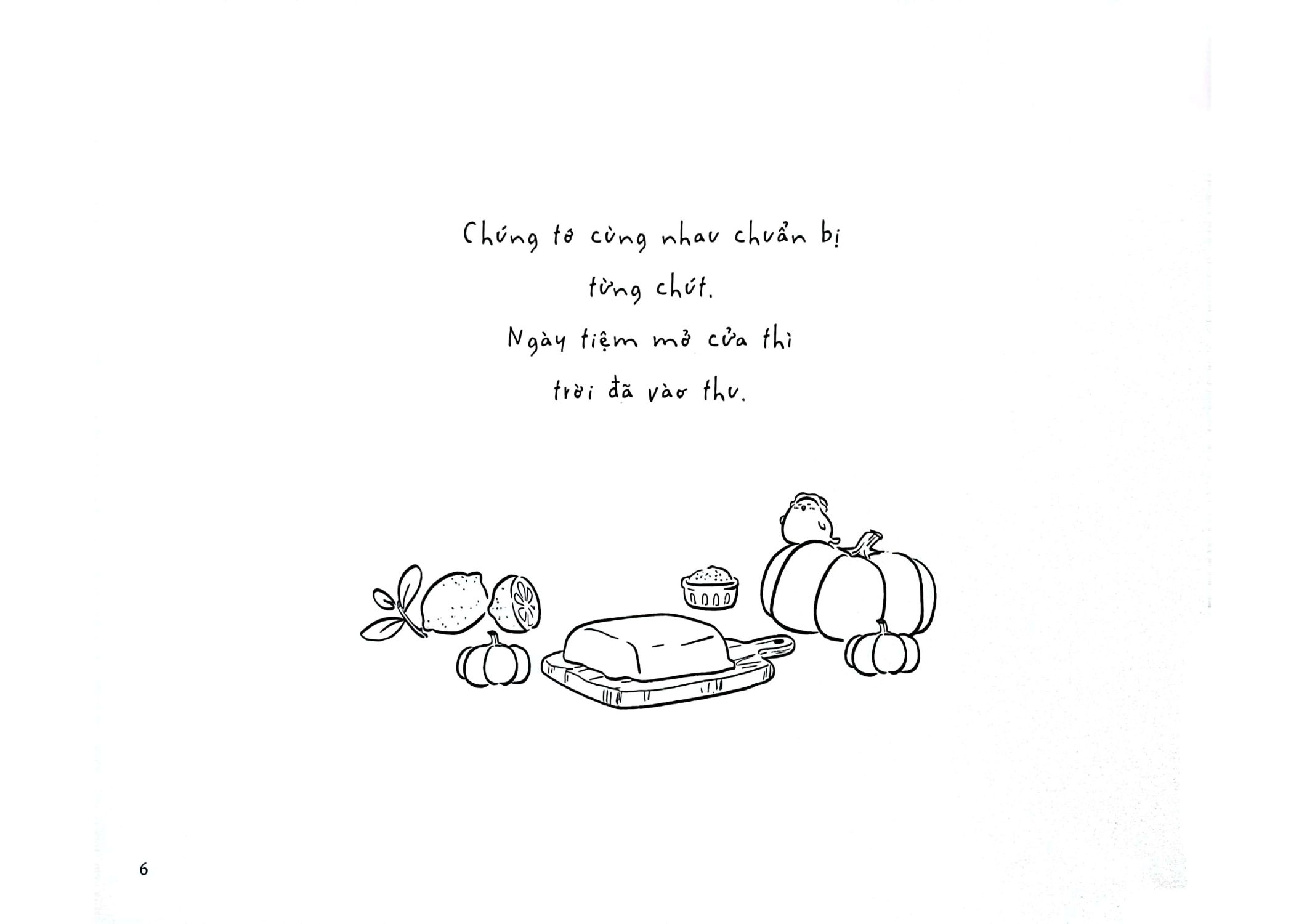 “Ở tiệm bánh Mùa Thu” vẫn gồm những trang vẽ xinh xắn về cuộc sống hàng ngày nơi tiệm bánh nhỏ. Tiệm bánh khi trời vào thu sẽ mang dáng vẻ như thế nào? Là những ngày thu lá vàng xào xạc cùng tiếng chim ríu rít hay sẽ thơm mùi bơ sữa ngọt ngào của những chiếc bánh mới ra lò? Góc bếp nhỏ xinh tràn đầy nguyên liệu làm bánh, những bạn cún đáng yêu đang nghịch ngợm, những quả hồng treo trong gió và những quả sồi tượng trưng cho một khởi đầu mới,… tiệm bánh ngày thu trong mắt bạn sẽ có những gam màu nào?