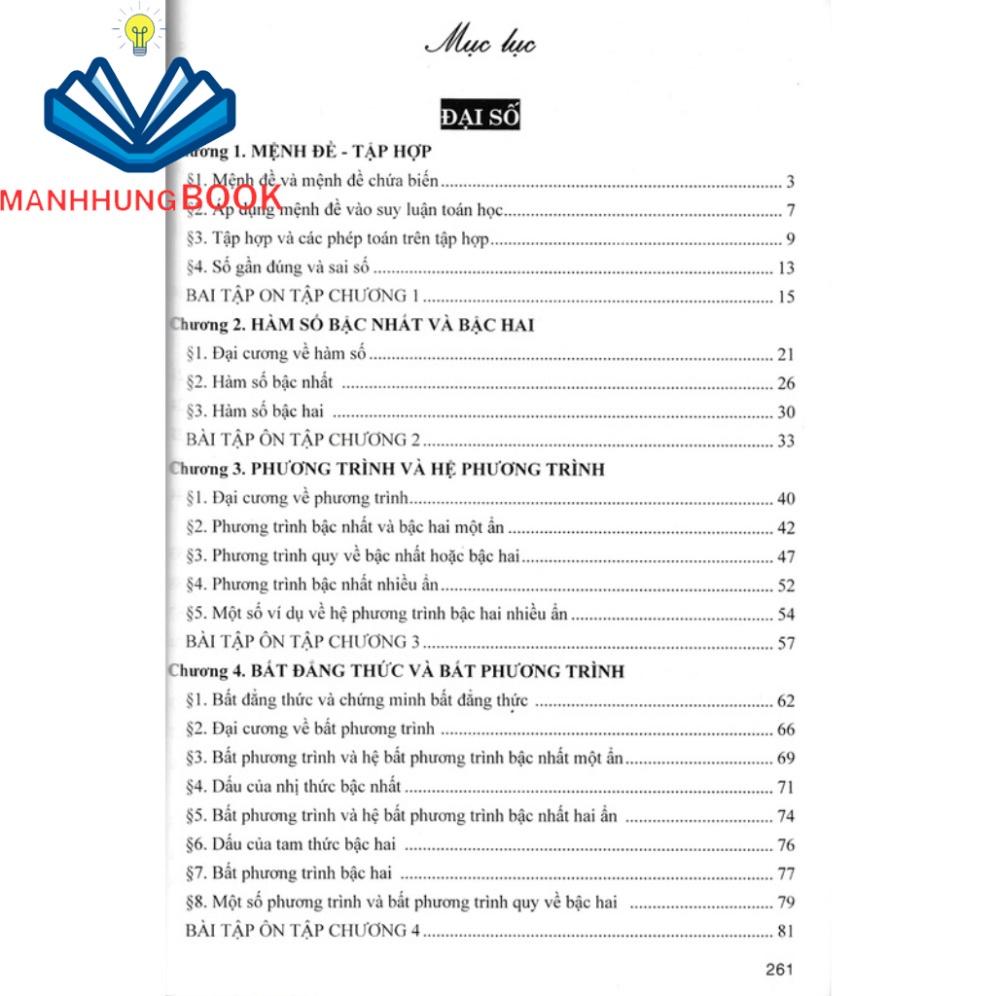 ĐẠI SỐ Chương 1: Mệnh đề - tập hợp Chương 2: Hàm số bậc nhất và bậc hai Chương 3: Phương trình và hệ phương trình Chương 4: Bất đẳng thức và bất phương trình Chương 5: Thống kê Chương 6: Góc lượng giác - công thức lượng giác