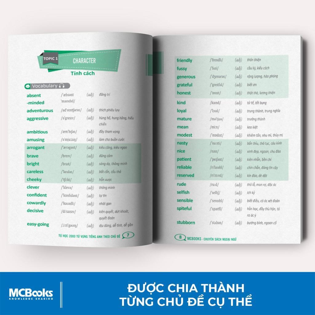 Cuốn sách “Tự học 2000 từ vựng tiếng Anh theo chủ đề” với 2000 từ vựng phổ biến, được sử dụng rộng rãi giúp người đọc dễ nhớ, dễ áp dụng từ vựng vào thực tế giao tiếp hoặc làm bài tập, bài thi.