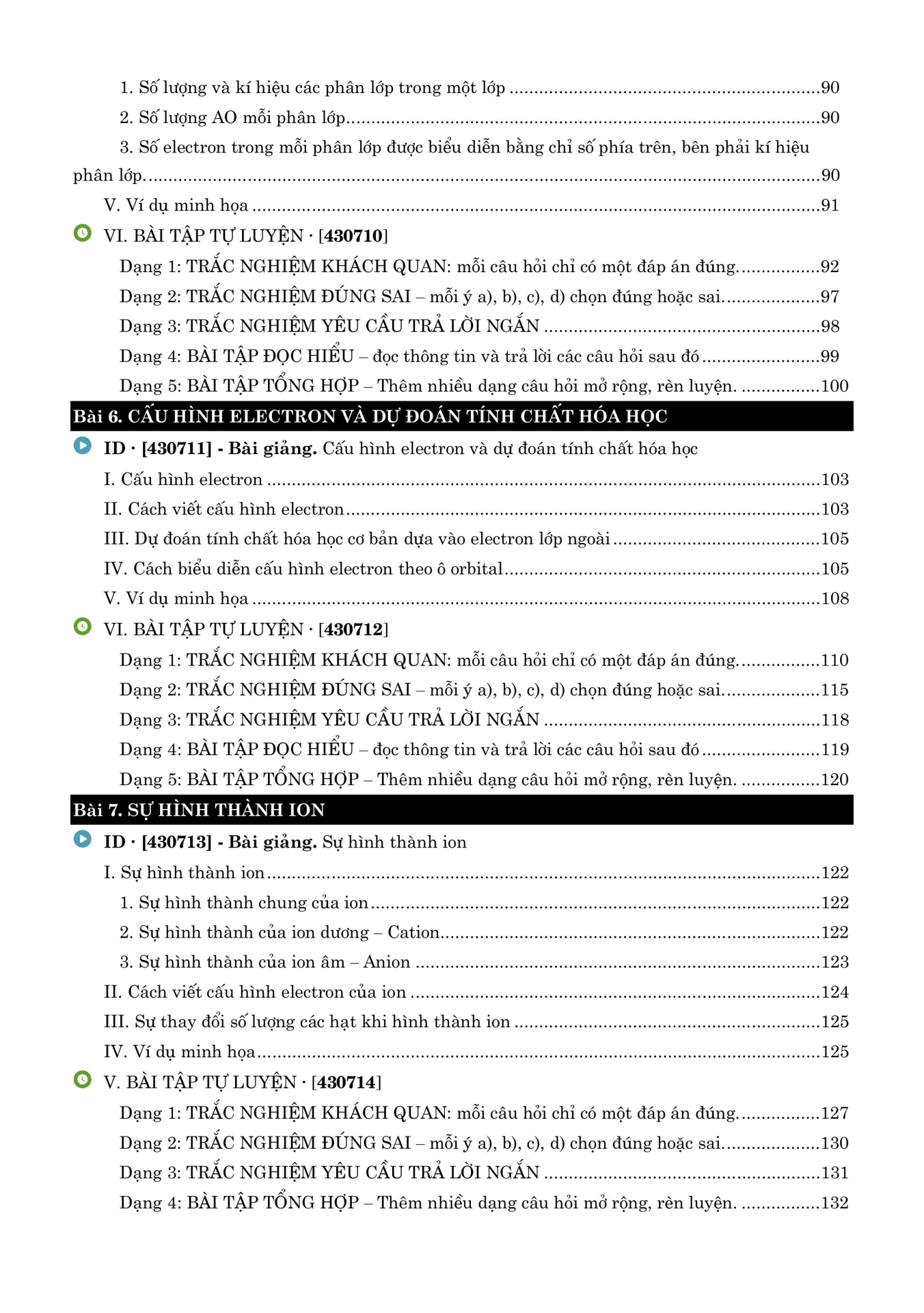- Chủ đề 4: Phản ứng oxi hoá - khử Nội dung cuốn sách được xây dựng thành 7 chủ đề, ở mỗi chủ đề được chia thành các phần: Mục tiêu, tóm tắt lí thuyết, ví dụ minh họa, bài tập tự luyện dưới dạng tự luận và trắc nghiệm khách quan.