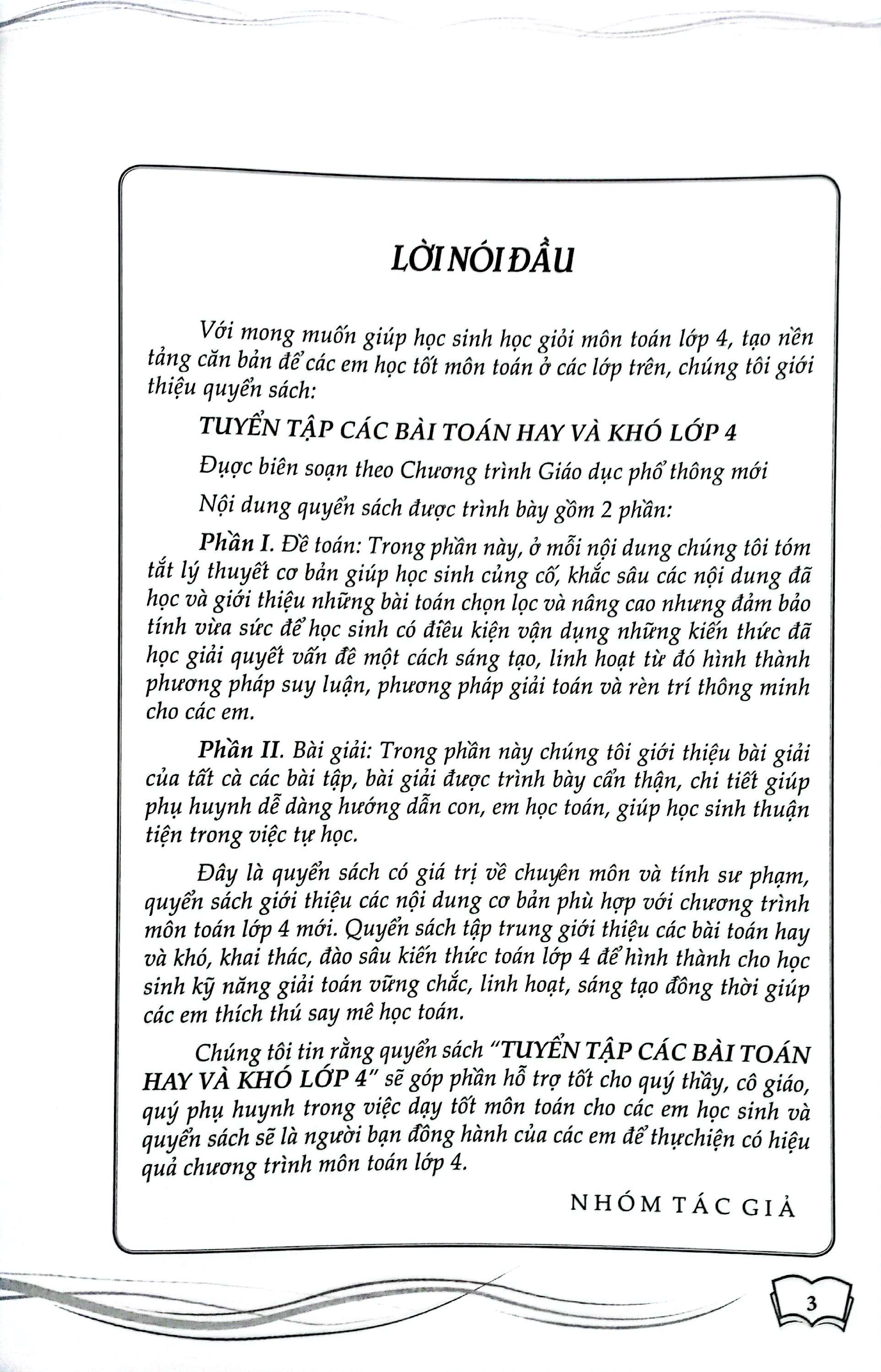 Chúng tôi tin rằng quyển sách “TUYỂN TẬP CÁC BÀI TOÁN HAY VÀ KHÓ LỚP 4” sẽ góp phần hỗ trợ tốt cho quý thầy, cô giáo, quý phụ huynh trong việc dạy tốt môn toán cho các em học sinh và quyển sách sẽ là người bạn đồng hành của các em để thựchiện có hiệu quả chương trình môn toán lớp 4.