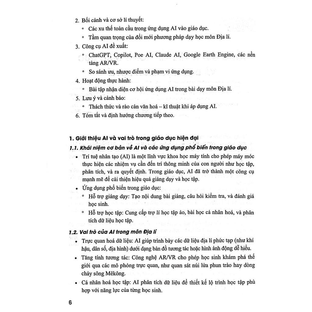 Cuốn sách Ứng dụng trí tuệ Nhân tạo (AI) Trong dạy và học môn Địa lí được xây dựng với hệ thống lí thuyết, công cụ và hoạt động thực hành cụ thể, nhằm hướng dẫn giáo viên tích hợp AI vào từng bước trong quá trình giảng dạy. Từ việc xây dựng bài giảng, chuẩn bị học liệu, tổ chức hoạt động trải nghiệm, đến kiểm tra và đánh giá học sinh, AI sẽ trở thành “người trợ lí đắc lực", giúp giáo viên tiết kiệm thời gian và nâng cao hiệu quả dạy học.