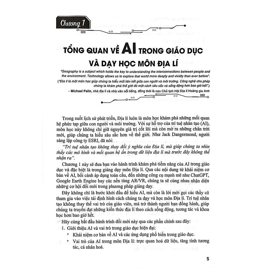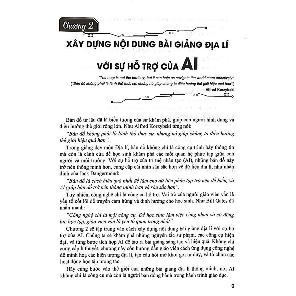 Cuốn sách này được viết với mục đích giúp giáo viên địa lí tận dụng sức mạnh của trí tuệ nhân tạo (AI) để đổi mới phương pháp dạy học, tạo nên những bài giảng sinh động, tương tác và giàu tính khám phá. AI không thay thế vai trò của giáo viên, mà ngược lại, nó giúp giáo viên trở thành người dẫn dắt học sinh khám phá thế giới với đôi mắt của nhà thám hiểm và tư duy của nhà khoa học dữ liệu. Như lời Joseph Kerski đã khẳng định: