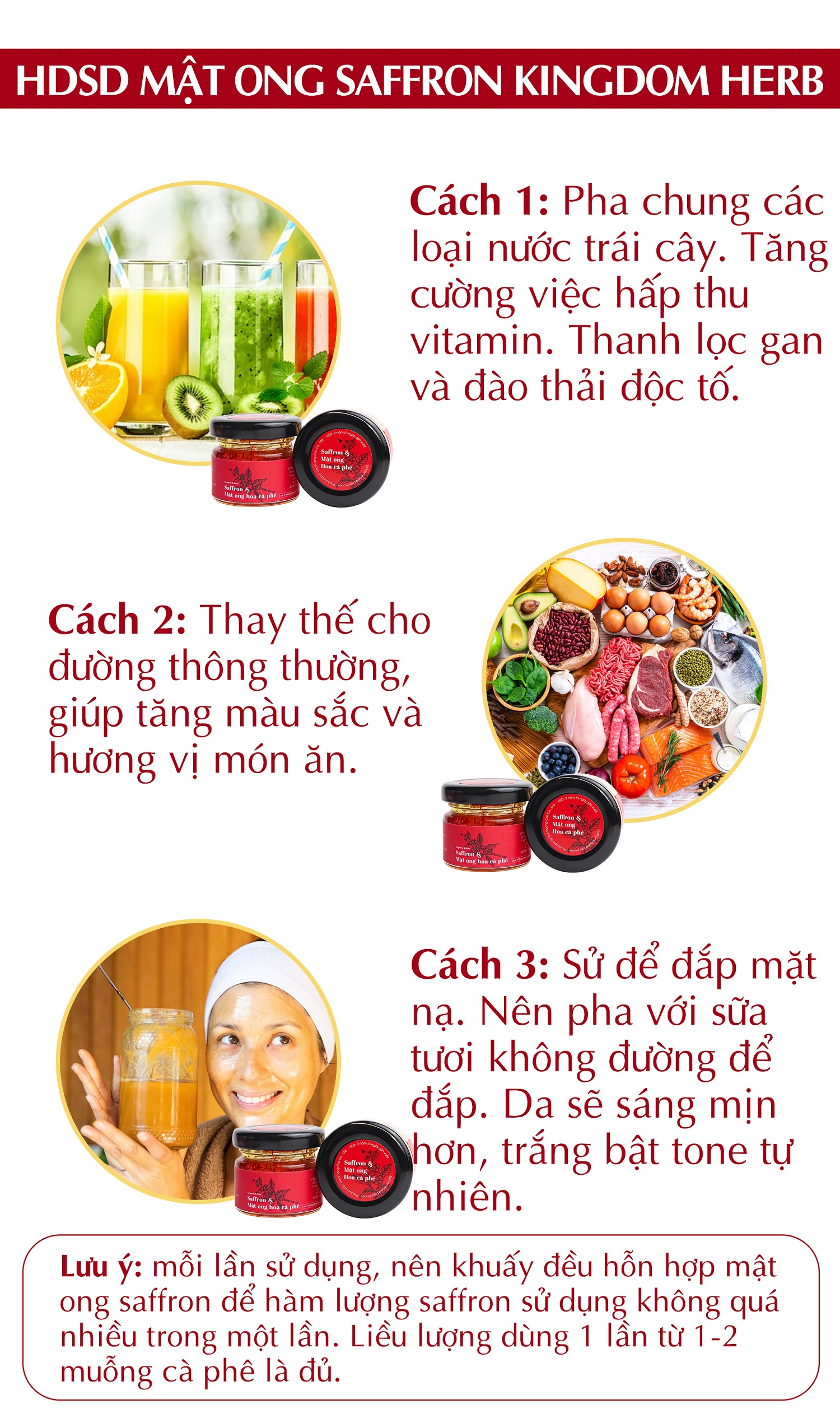 Cách dùng mật ong nhụy hoa nghệ tây saffron Kingdom (xem trên album hình ảnh):