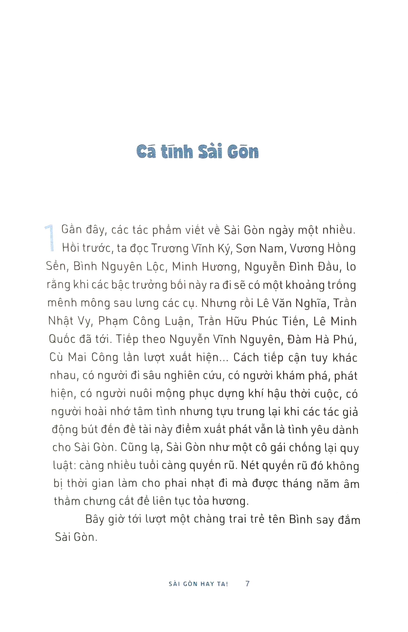 "Ở thành phố này, không ai buồn quá lâu đâu. Nghe thành phố thở đi, trong hơi thở đó có người Nghệ An, người Hà Nội, người Huế, người Hoa, người Khmer, người Hàn, người Mỹ Trong hơi thở đó có ta, có mình. Một thành phố tổng hợp mà không ô hợp, một thành phố xóa đi bản ngã, để dù có gốc gác ở nơi nào đi nữa cũng có thể nói tôi là người Sài Gòn.” Những trang viết sống động và giàu cảm xúc, khi lãng mạn khi hóm hỉnh của Bình Bồng Bột về Sài Gòn, hòa với sắc màu rực rỡ tươi mới trong những bức tranh của Thăng Fly, đã khắc họa thật trìu mến một thành phố của đại lộ thênh thang và ngõ hẻm lắt léo, của nỗi hoài niệm quá khứ và cuộc chuyển mình hiện đại, của cái bất biến và sự đổi thay, nhưng trên tất cả, là của những con người ấm áp khiến ta tin vào điều tử tế trong cuộc sống. Sài Gòn hay ta! là một tiếng thốt lên sảng khoái, cũng có thể là suy ngẫm tâm đắc của các tác giả về sự bao dung và chân tình của thành phố không bao giờ chịu già này. “Sau khi đi suốt mấy trăm trang sách để tìm chân dung người Sài Gòn, vật cả còn hơn đi tìm chân dung tình yêu, có vẻ tác giả cũng dần dà nhìn thấy ánh sáng ở cuố cuốn sách. Chàng gật gù tâm đắc: Người Sài Gòn tức là người hay nói câu "Người mình với nhau mà!'. Rút ra được kết luận đó, chàng trai trẻ tên Bình xem ra chẳng 'bồng bột' chút nào!" -Nhà văn Nguyễn Nhật Ánh Bình Bồng Bột